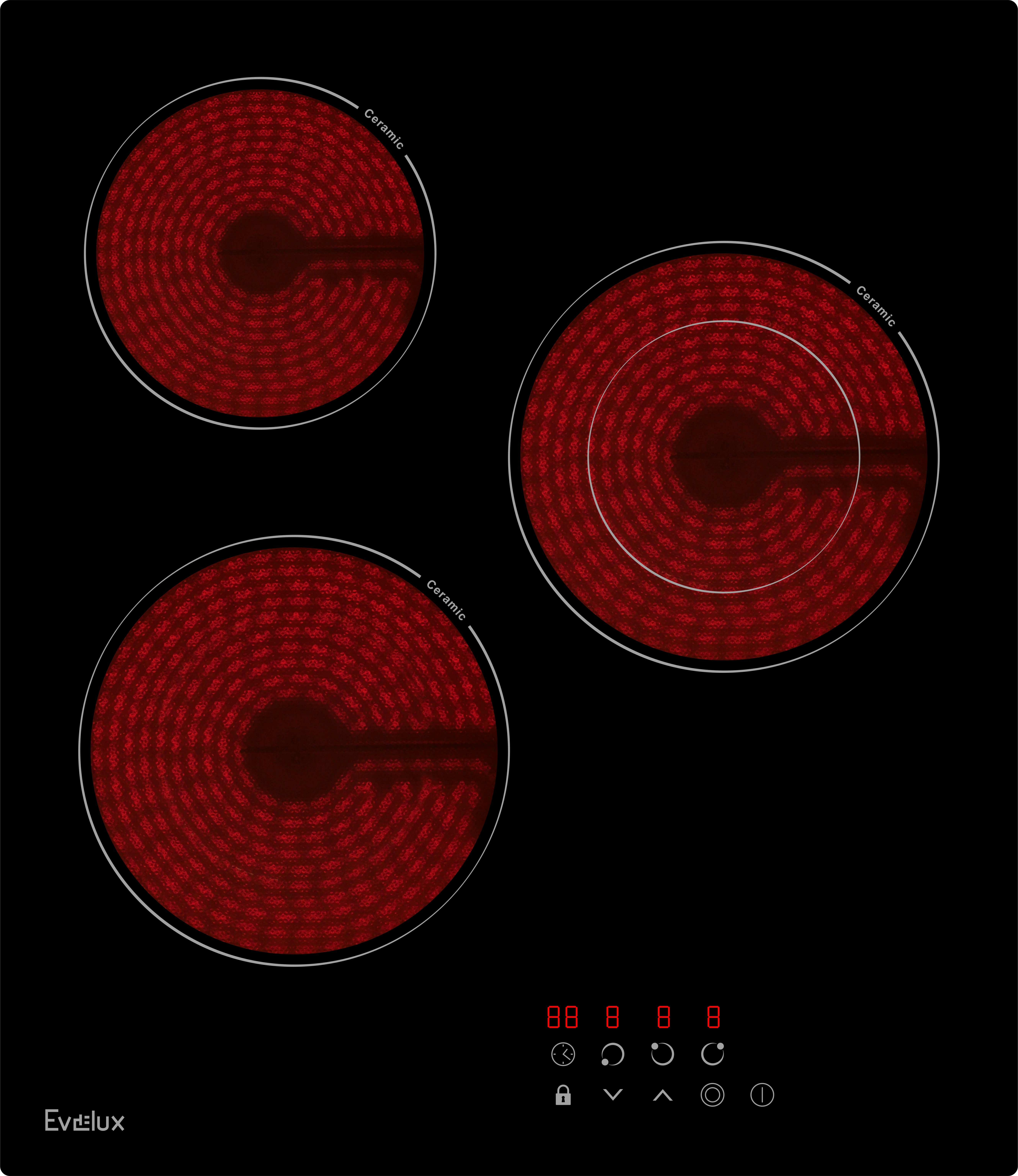 Зоны нагрева Evelux оборудованы современными нагревательными элементами Hi-light. Конфорка достигает установленной рабочей температуры буквально за считанные секунды, позволяет плавно регулировать мощность.