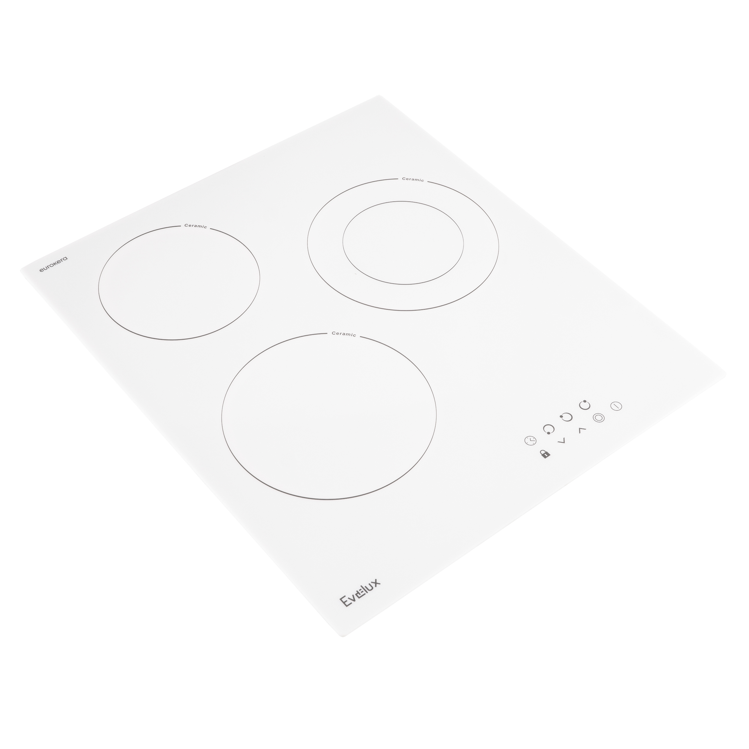 Варочная панель электрическая, стеклокерамика, Hi Light, 45 см, 3 конфорки, сенсорное управление, 9 уровней мощности, таймер 1-99 мин, блокировка управления, защитное отключение, двухконтурная, 5000 Вт, белое стекло Eurokera (Франция), 450х520х50 мм.