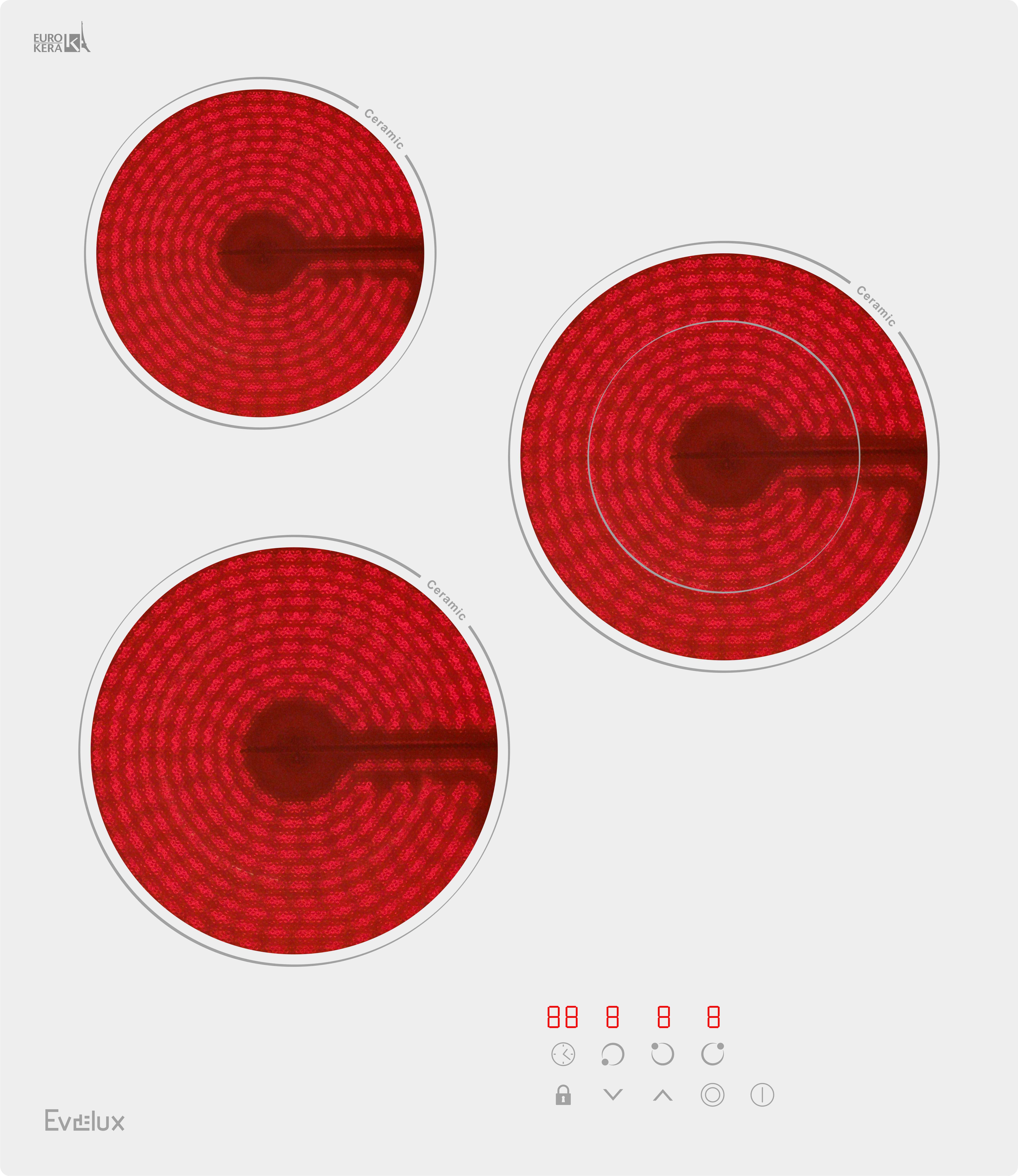 Зоны нагрева Evelux оборудованы современными нагревательными элементами Hi-light. Конфорка достигает установленной рабочей температуры буквально за считанные секунды, позволяет плавно регулировать мощность.