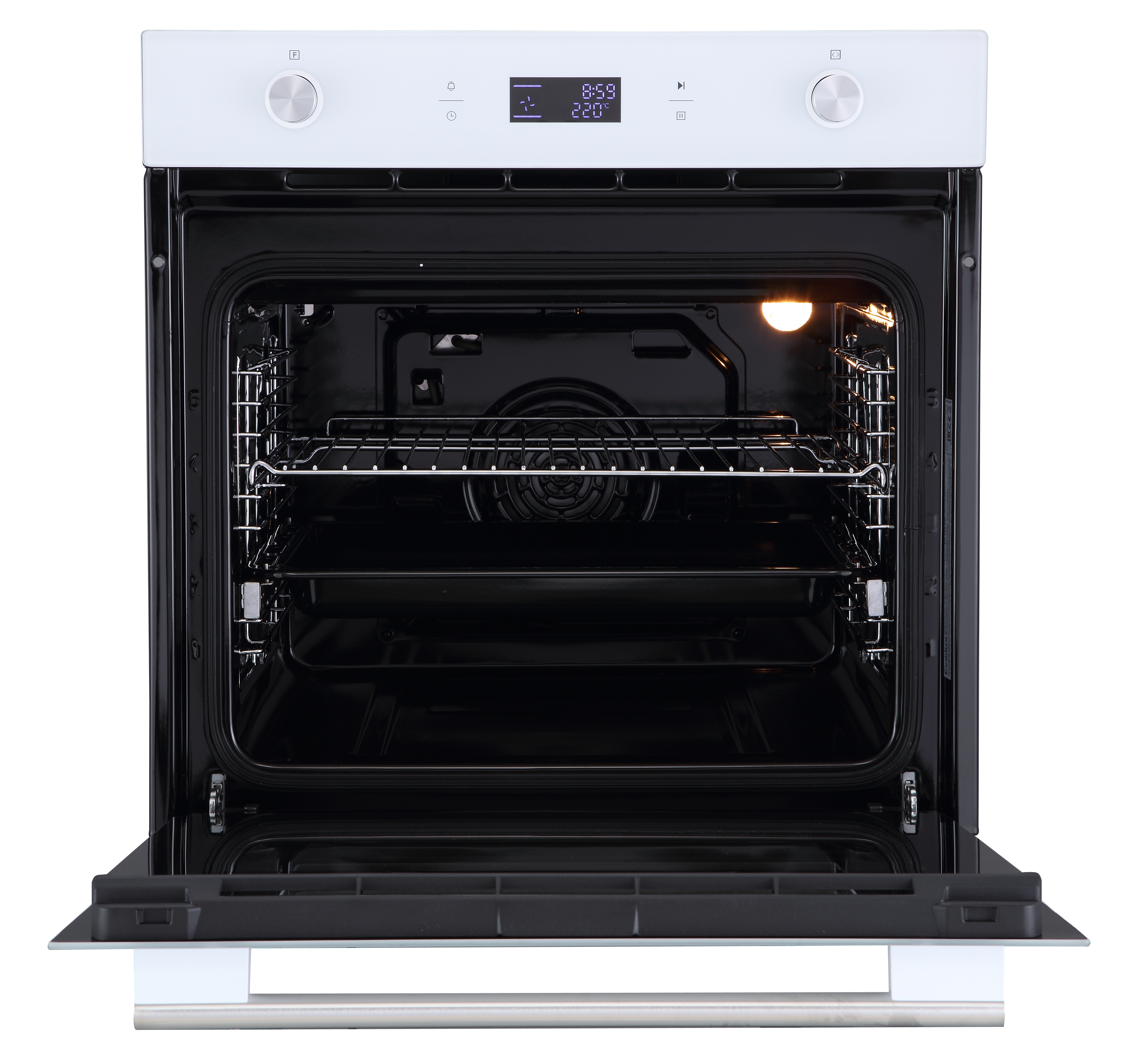 Электрический духовой шкаф встраиваемый полноразмерный, 60 см, 9 режимов, объем духовки 70л, утапливаемые переключатели, большой дисплей Snow White, хромированные боковые решетки, телескопические направляющие 1 уровнь, панель управления - белое стекло, универсальный противень, решетка-гриль, тройное стекло дверцы, легко-съемное большое внутреннее стекло Full Glass, защитное отключение, охлаждающий вентилятор, электронный таймер 9 часов, 595х575х595 мм.