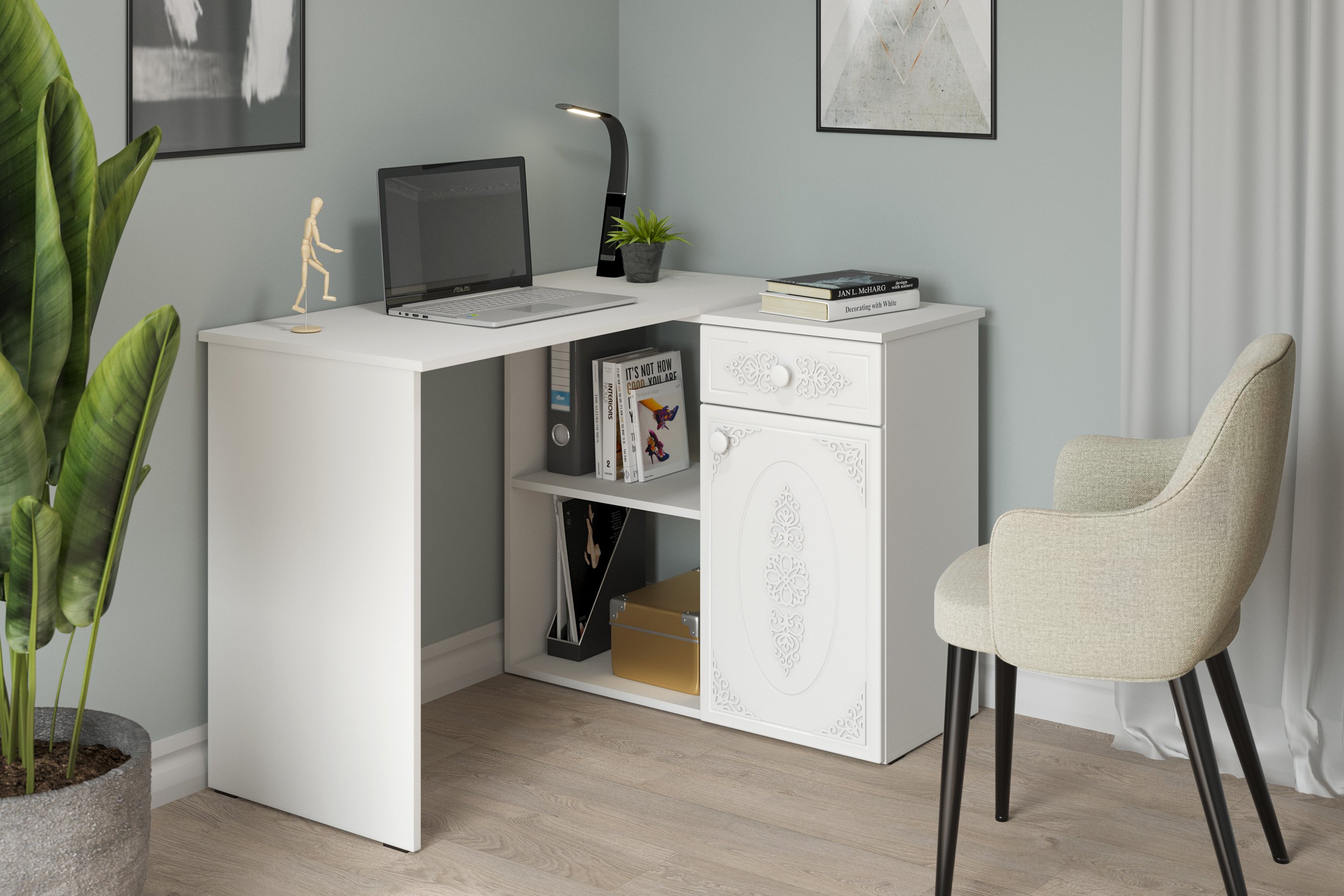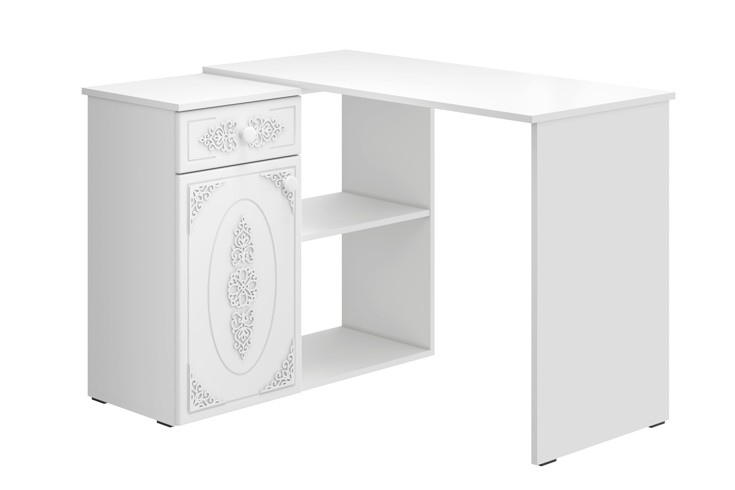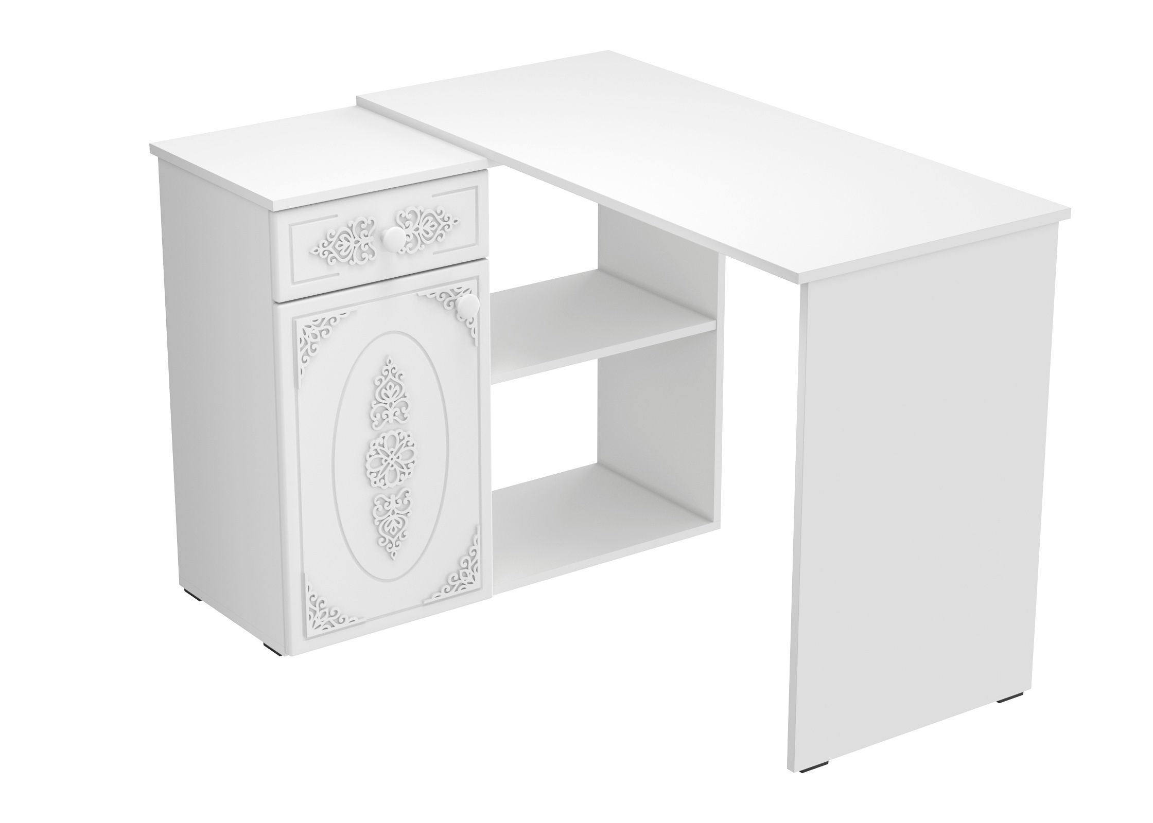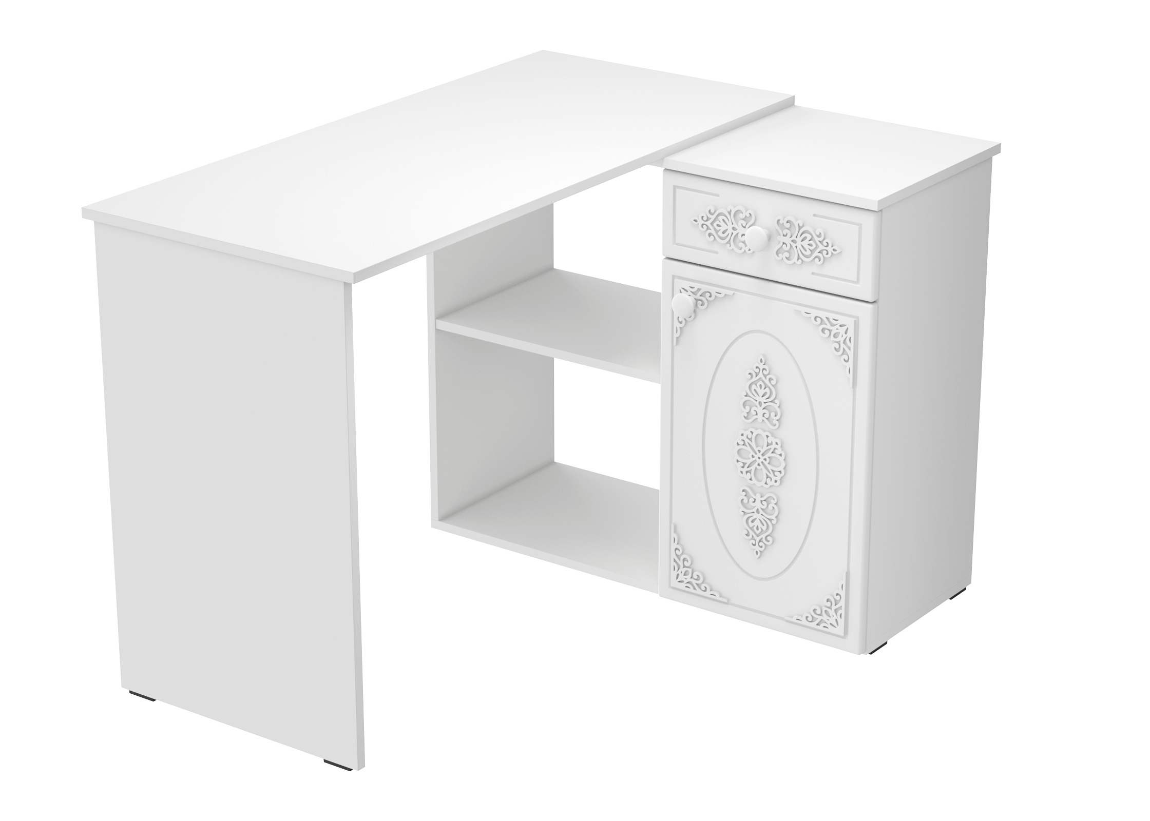 Угловой стол Ассоль АС-67 станет отличным местом для работы. В выдвижном ящике можно хранить блокнот, канцелярские принадлежности. Стильный дизайн позволит разместить в любом современной интерьере. Модуль может быть собран в зеркальном варианте "правым" или "левым". Фурнитура: телескопические направляющие полного выдвижения, петли с доводчиками.