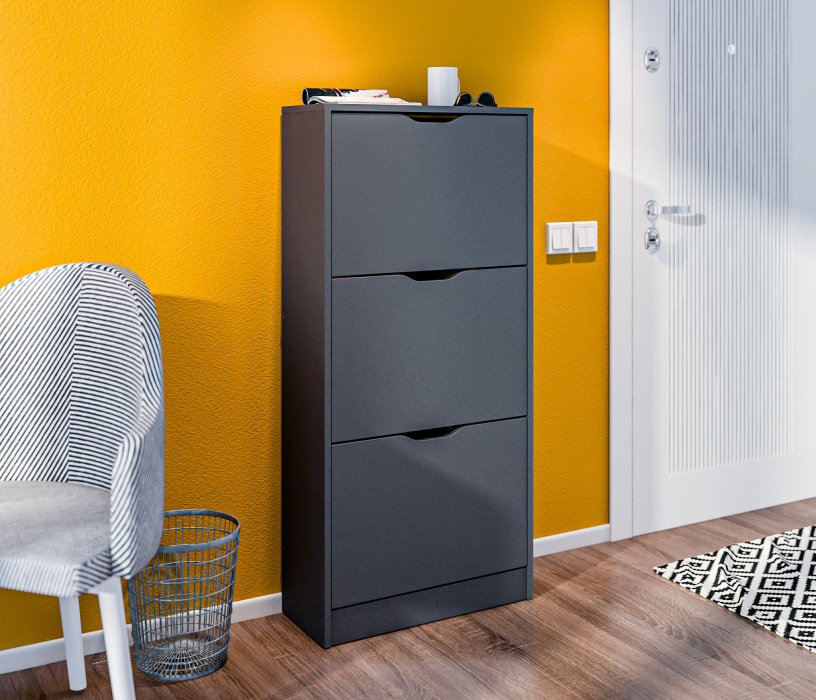 Габаритные размеры – ширина 59 см, высота 126 см и глубина 25 см. Обувница имеет три отделения, каждое из которых оснащено специальными стойками для хранения обуви. Прорезные ручки и строгие геометрические формы позволяют вписать обувницу в любой интерьер. Обувница произведена из экологичного прочного КДСП, устойчивого к мелким механическим повреждениям.