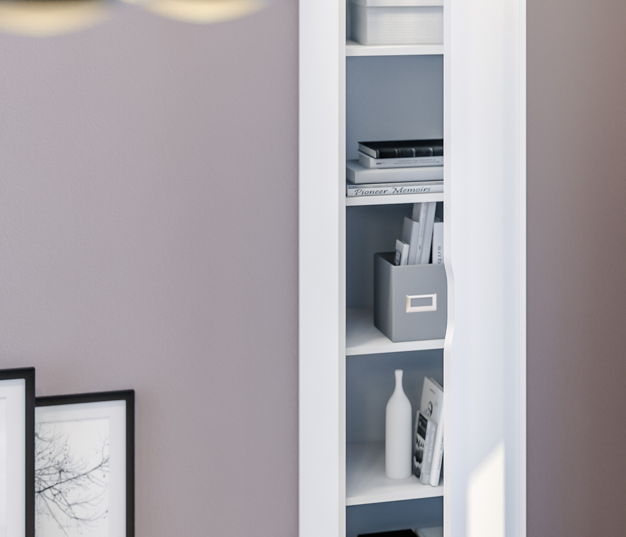 Габаритные размеры – ширина 43,2 см, высота 200,4 см и глубина 40,3 см. Шкаф имеет закрытое отделение с четырьмя глубокими полками, в нижней части шкафа расположен вместительный выдвижной ящик.