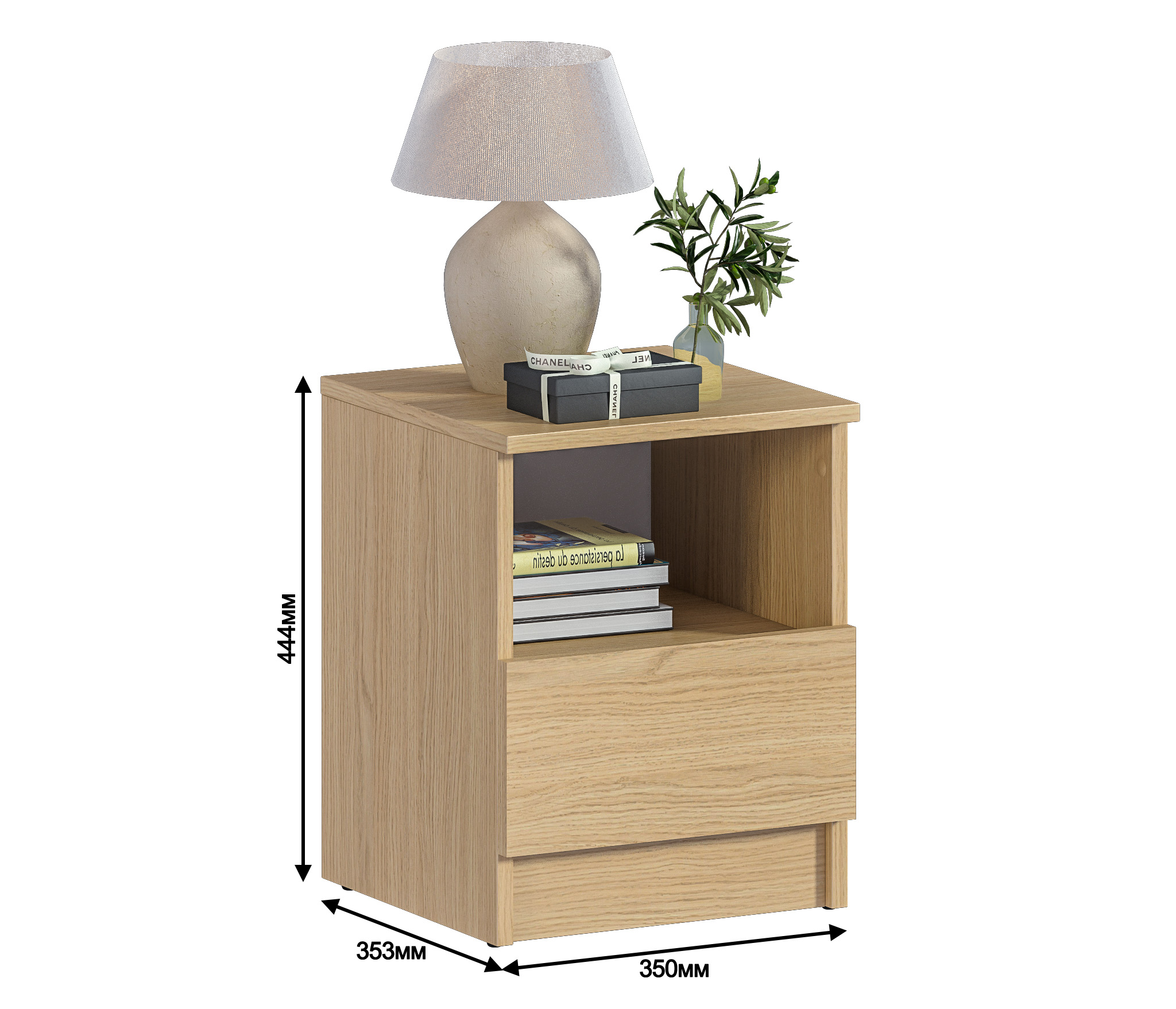 При компактных габаритных размерах – ширина 35 см, высота 44,4см и глубина 35,3 см, тумба довольно вместительная. Под столешницей расположены открытая полка и выдвижной ящик, куда можно положить планшет или книгу.