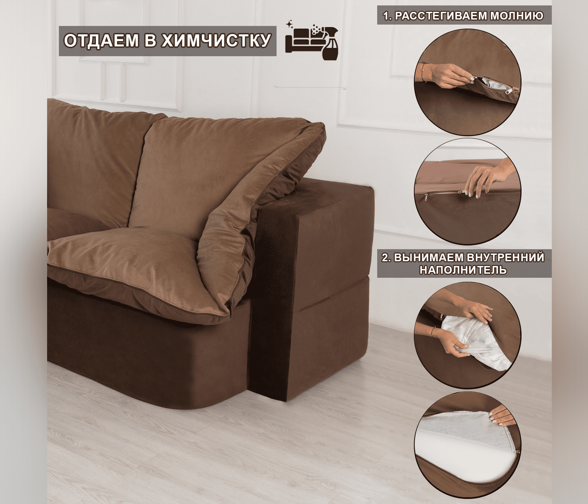 Еще одно преимущество данного дивана - наружный чехол легко снимается благодаря застежкам-молниям, которые легко можно снять и отдать в хим. чистку.
