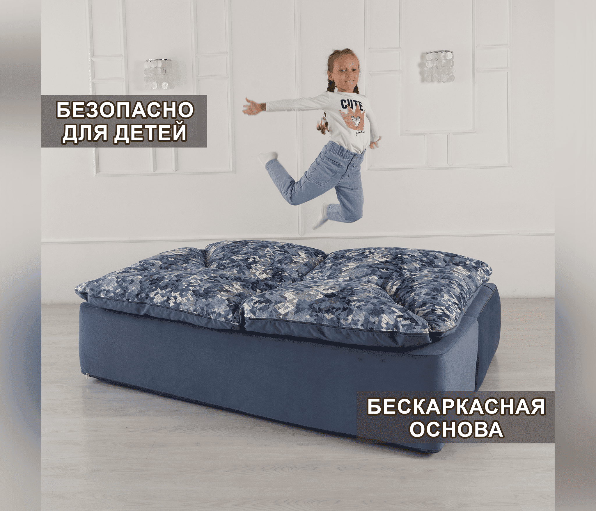 В-третьих, абсолютно безопасный для детей – в нем все детали мягкие, не острых углов. Диван без каркаса не вызывает аллергии, так как для его производства не используются ДСП и прочие материалы с резким запахом и формальдегидами.