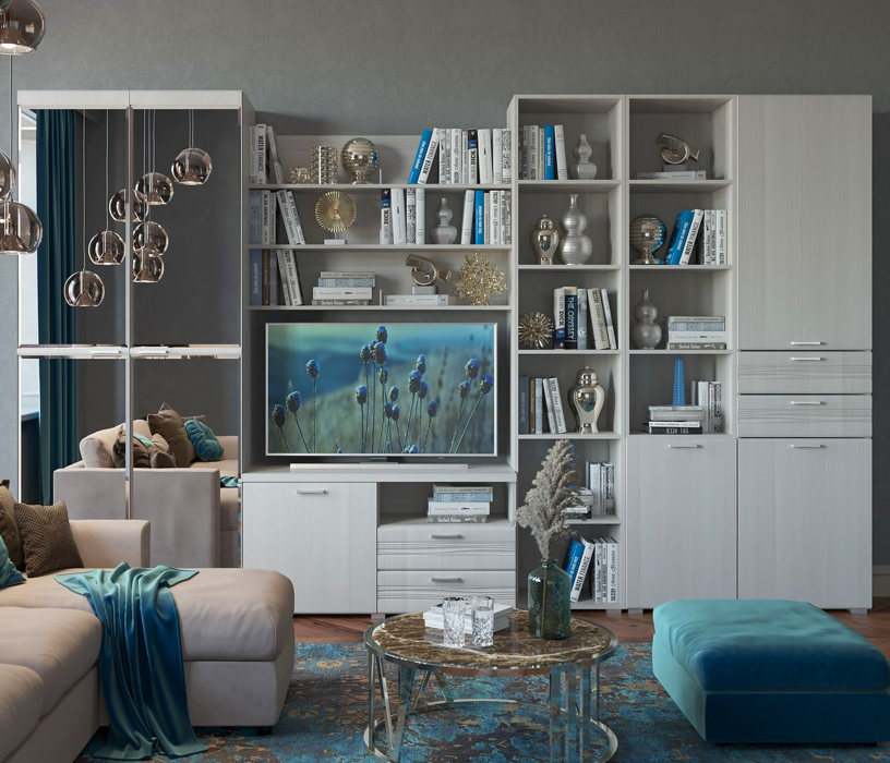 Вариант пенала из комплекта модульной гостиной Лотос. Отличие от другого стеллажа серии в том, что две нижние полки закрыты дверцей. Регулируемые опоры L-20. Ручка 96 мм. Можно приобрести и отдельно.