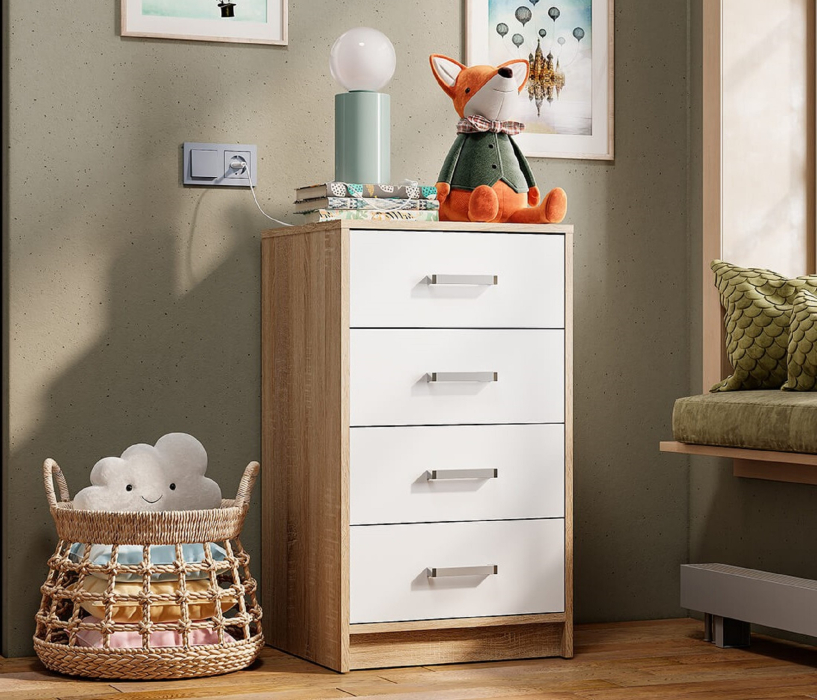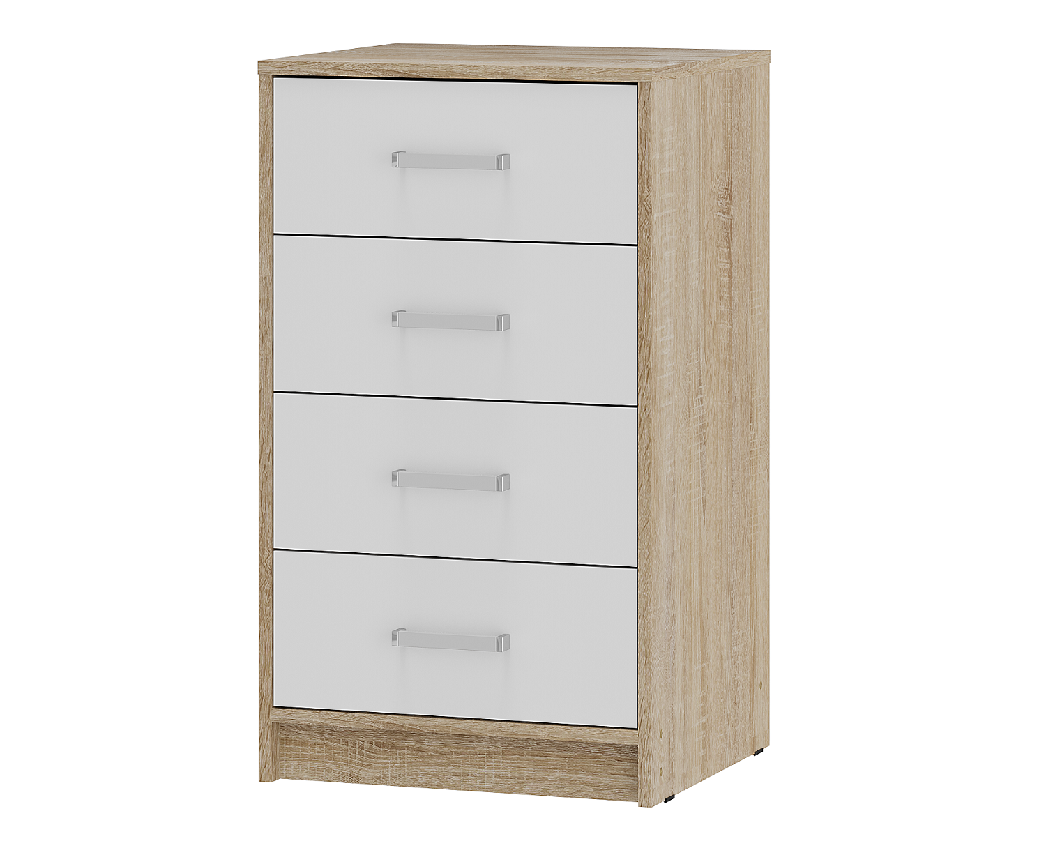 Высокий комод Мия отлично справится с вопросом хранения одежды в сложенном виде, вещей, постельного белья, игрушек, сезонных аксессуаров и всего того, что должно храниться в порядке. 4 выдвижных ящика оснащены роликовыми направляющими и удобными ручками. Регулируемые опоры позволяют установить комод даже на неровном полу.