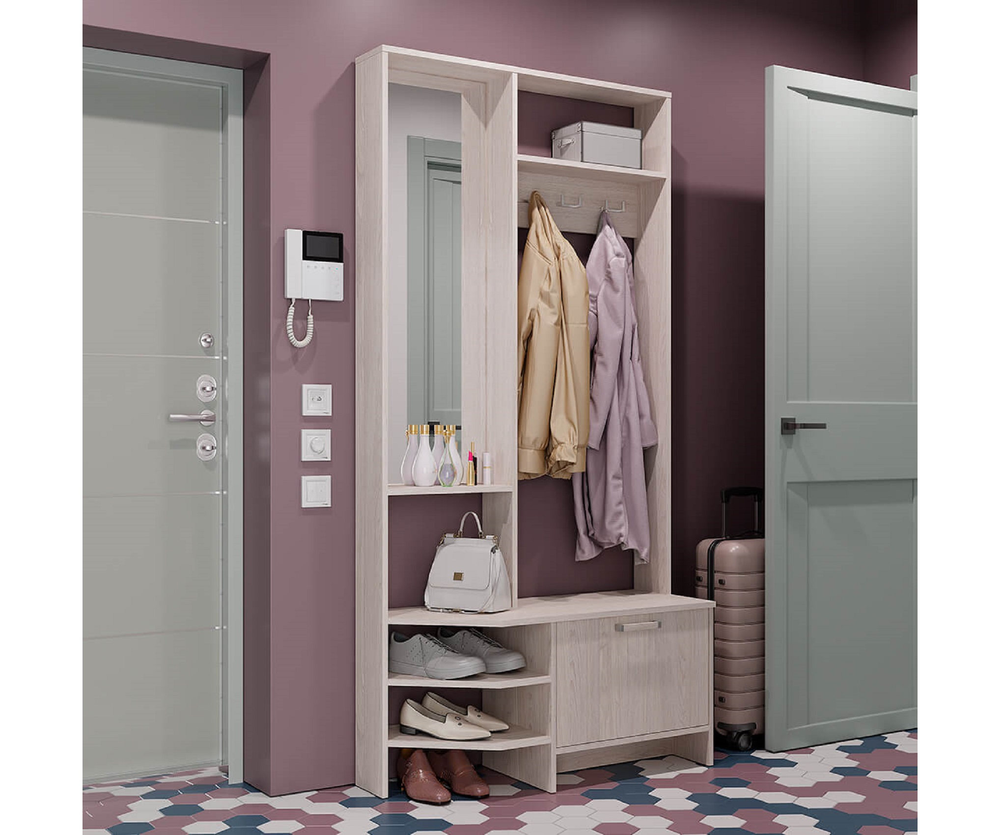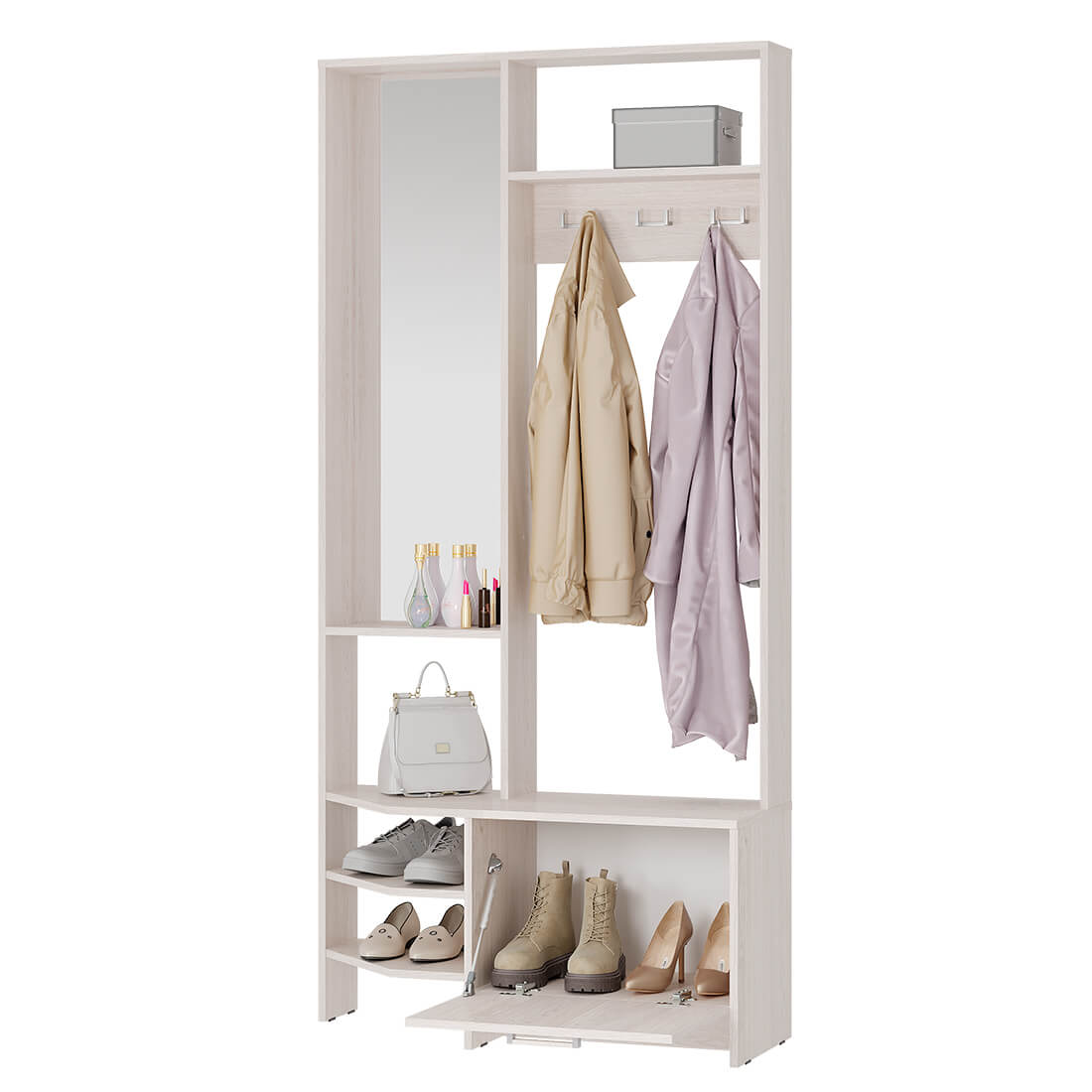 Большое зеркало, открытая верхняя полка для головных уборов и сезонных аксессуаров, крючки для верхней одежды, а также закрытая тумба-обувница и комплект полок для домашней обуви – все, что нужно для Вашего комфорта в прихожей.