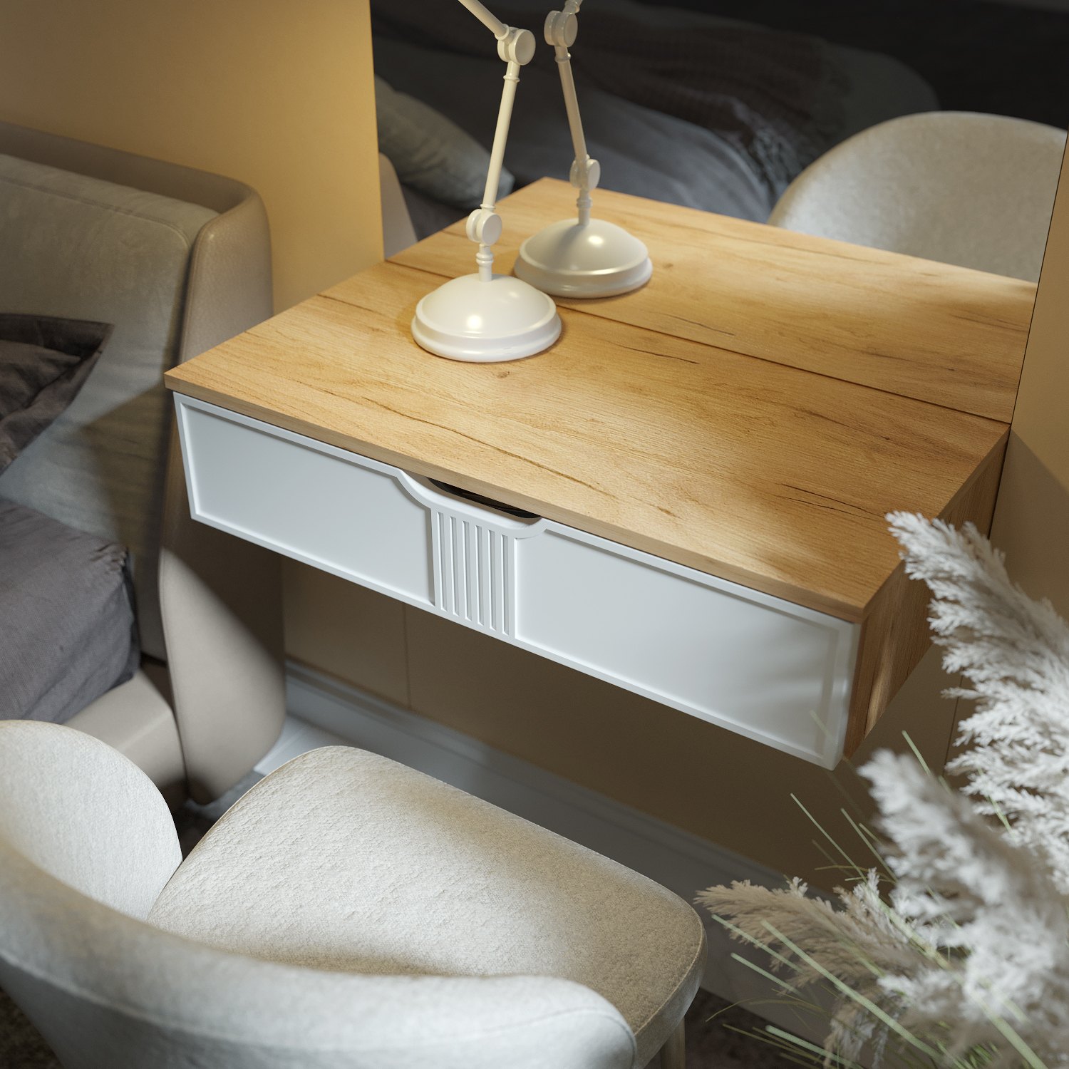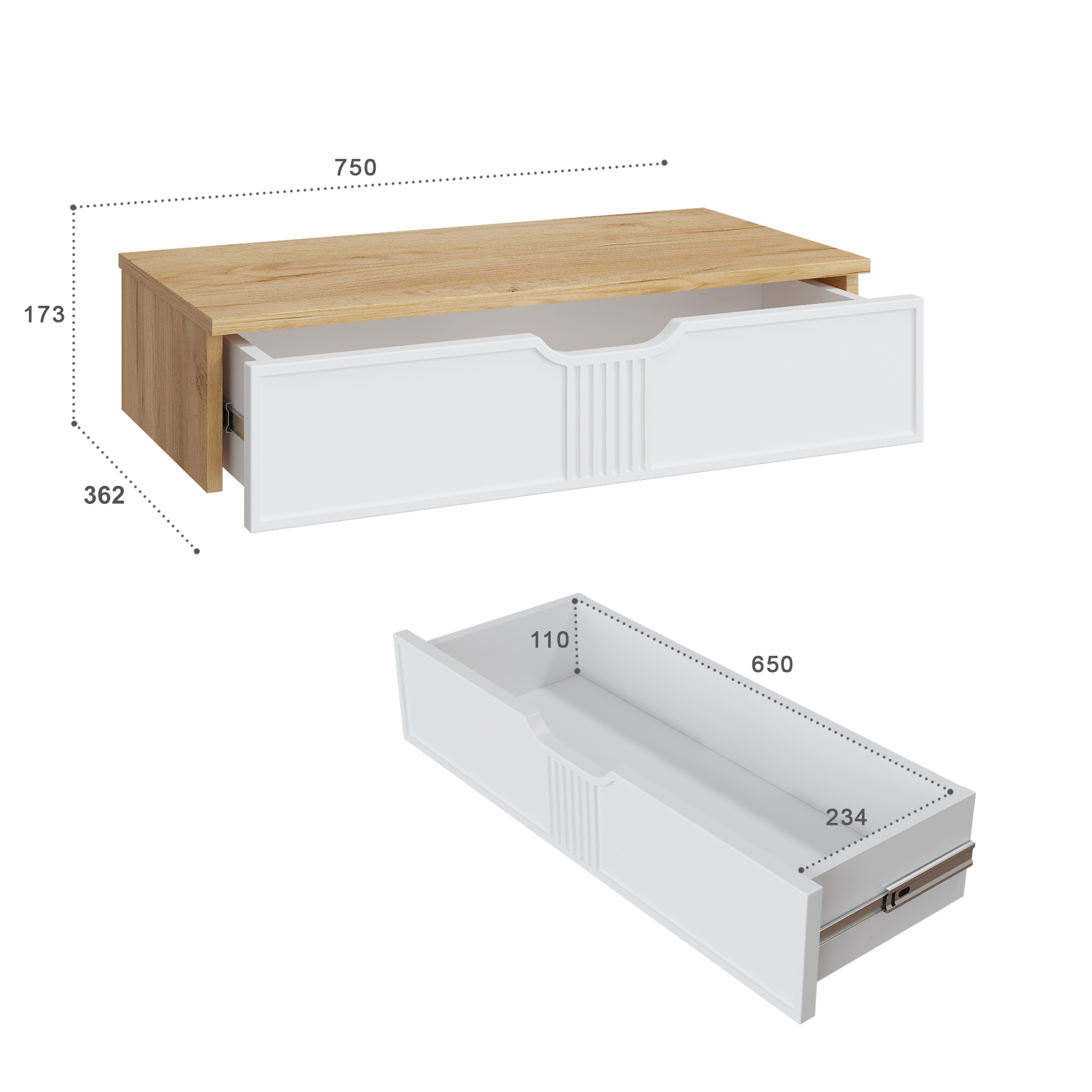 Тумба подвесная/консольный столик Эмилия ЭЛ-22 с выдвижным ящиком идеально впишется в любой интерьер. Изящный дизайн, функциональность и компактность, а так же его крепление на стену позволяют создать интересное дизайнерское решение и интерьер не будет выглядеть громоздко. Отсутствие лишних деталей делает консоль легкой и практичной не загромождает пространство визуально. Несмотря на компактный размер столешница позволяет разместить ноутбук, зеркало, косметичку, настольную лампу или все для учебы и творчества. Установить можно практически в любом помещении: в детской комнате, в гостиной, в прихожей, на балкон или лоджию как полка для зеркала, для ключей, для создания индивидуального интерьерного решения. Дополнив тумбу зеркалом ЭЛ-24 вы создадите прекрасный комлект. Фурнитура: телескопические направляющие полного выдвижения без доводчиков. Важная информация. Мебель доставляется в разобранном виде, в упаковках.