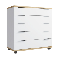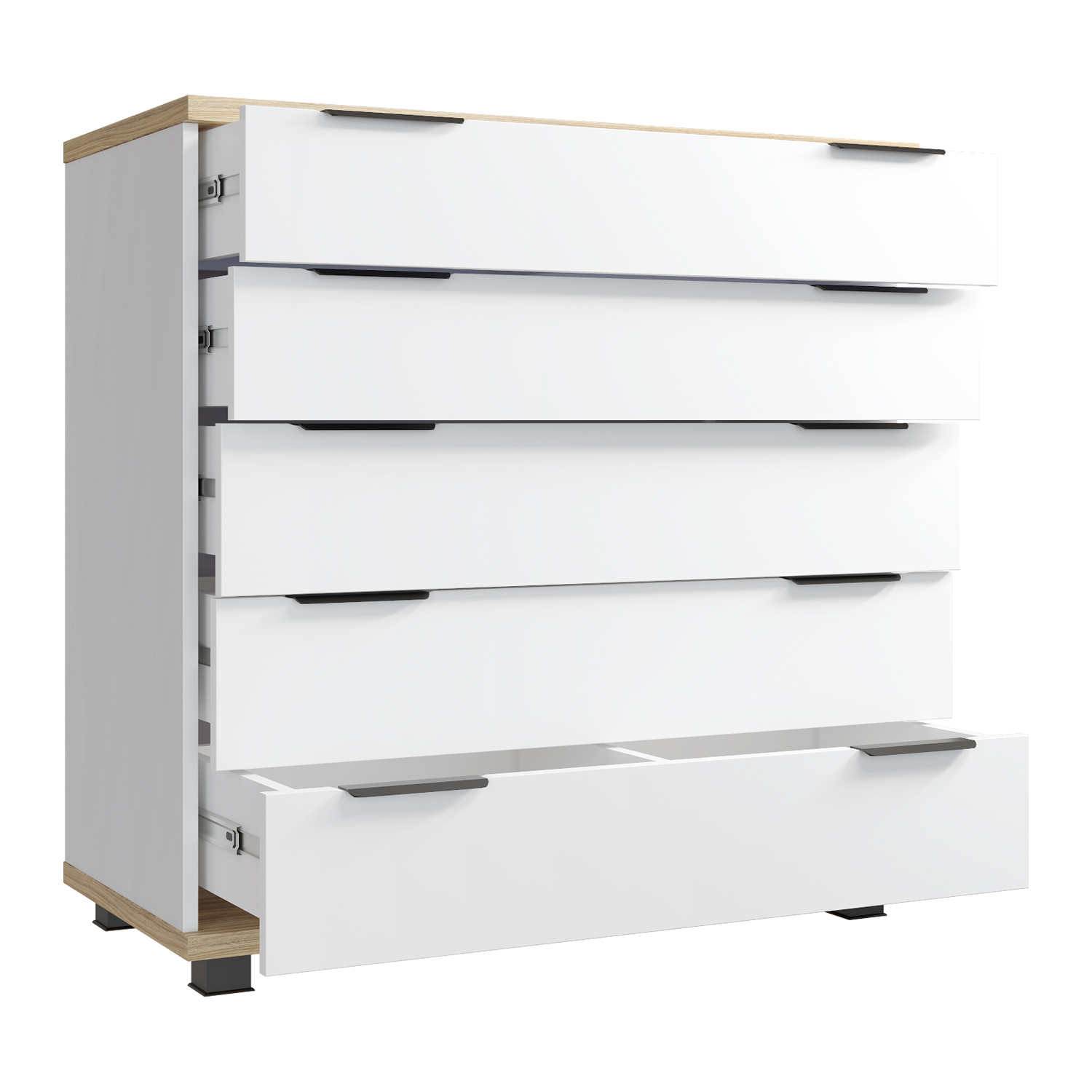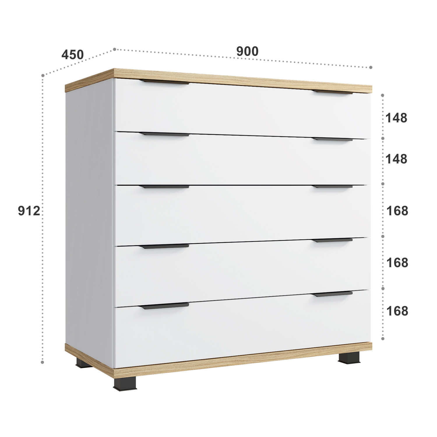 Комод имеет пять широких выдвижных ящика для хранения вещей или игрушек. Два верхних ящика имеют фасады высотой 148 мм. Три нижних ящика имеют фасады высотой 168 мм.