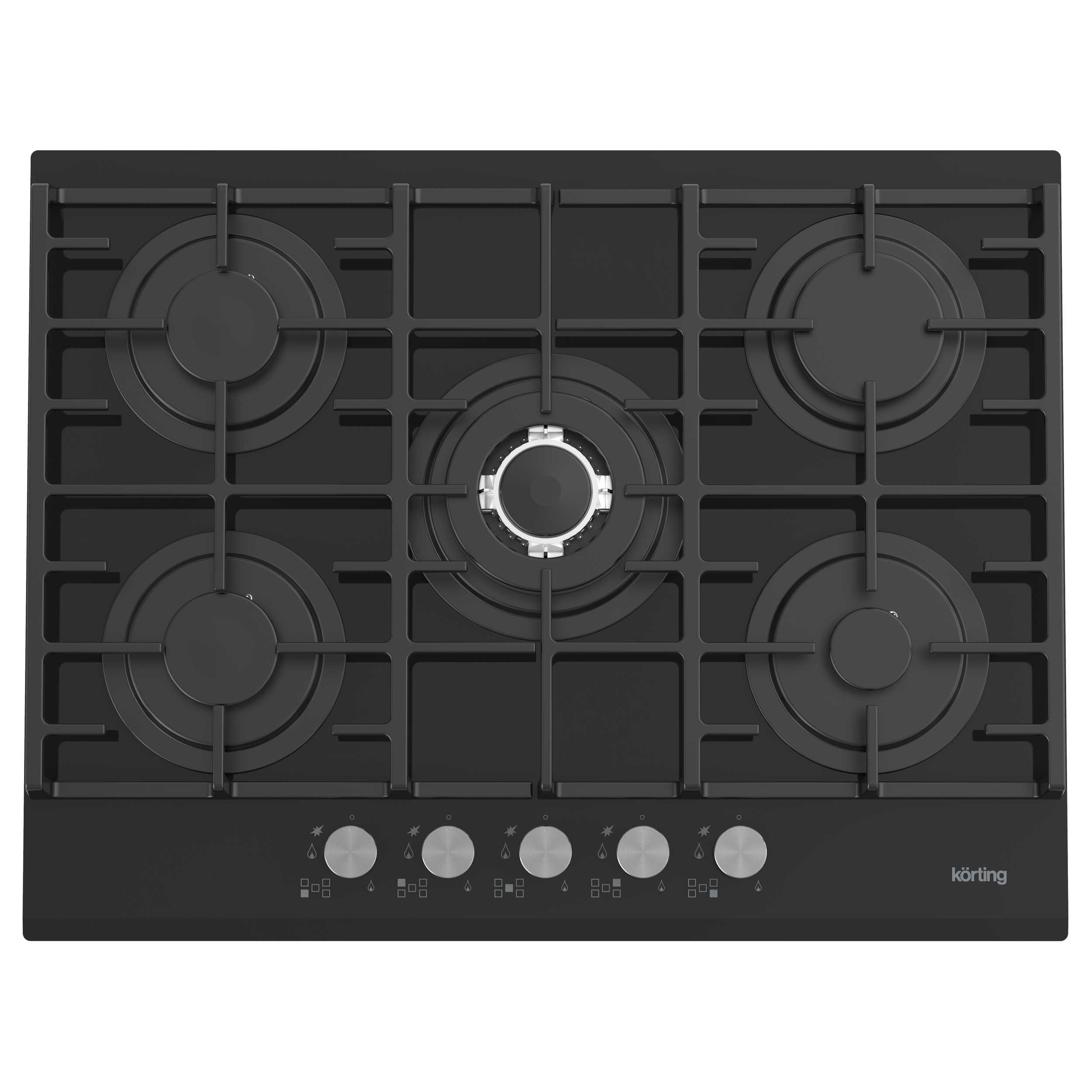 Газовая варочная панель из закаленного стекла, ширина 70 см, 5 высокоэффективных конфорок, сверхмощная конфорка WOK 3,8 кВт, автоматический электроподжиг, газ-контроль каждой конфорки, передние металлические переключатели, чугунные решетки для посуды, в комплекте - чугунная подставка WOK, адаптер для кофейника, скошенный передний край.