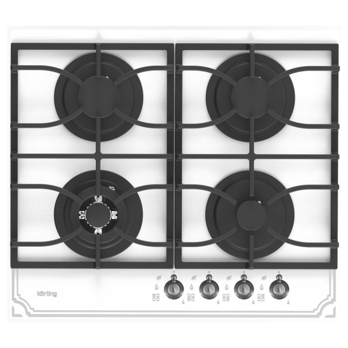 Газовая варочная панель из закаленного стекла 60 см, закаленное стекло, 4 высокоэффективные конфорки, WOK-сверхмощная конфорка с тройным рядом пламени, автоматический электроподжиг, газ-контроль каждой конфорки, переднее расположение поворотных регуляторов, цельные чугунные решетки, в комплекте - подставка WOK, цвет - белое стекло, цвет регуляторов - состаренное серебро.
