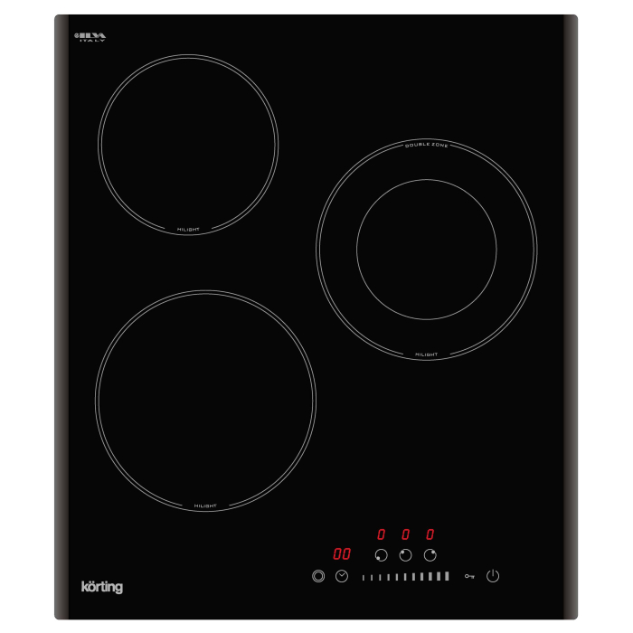 Электрические поверхности Hilight. Стеклокерамика, ширина 45 см, 3 зоны нагрева Hilight, Сенсорное слайдерное управление Двойная круглая зона расширения, Дисплей, Таймер, Функция ""Защита детей"", Автоматическое отключение, Индикация остаточного тепла, Цвет поверхности: черный, Дизайн рамки - 2 скошенных края.