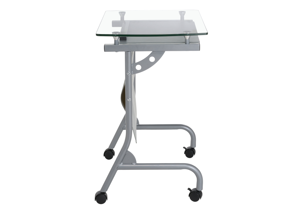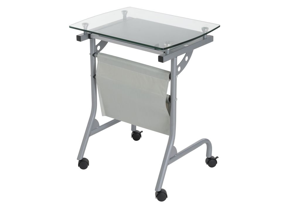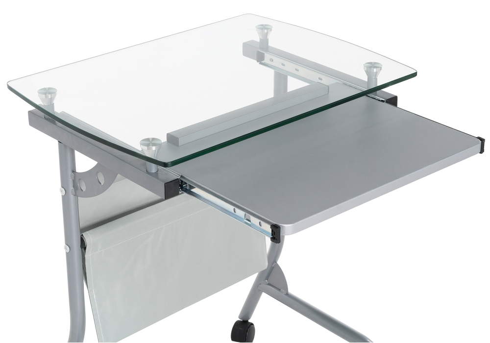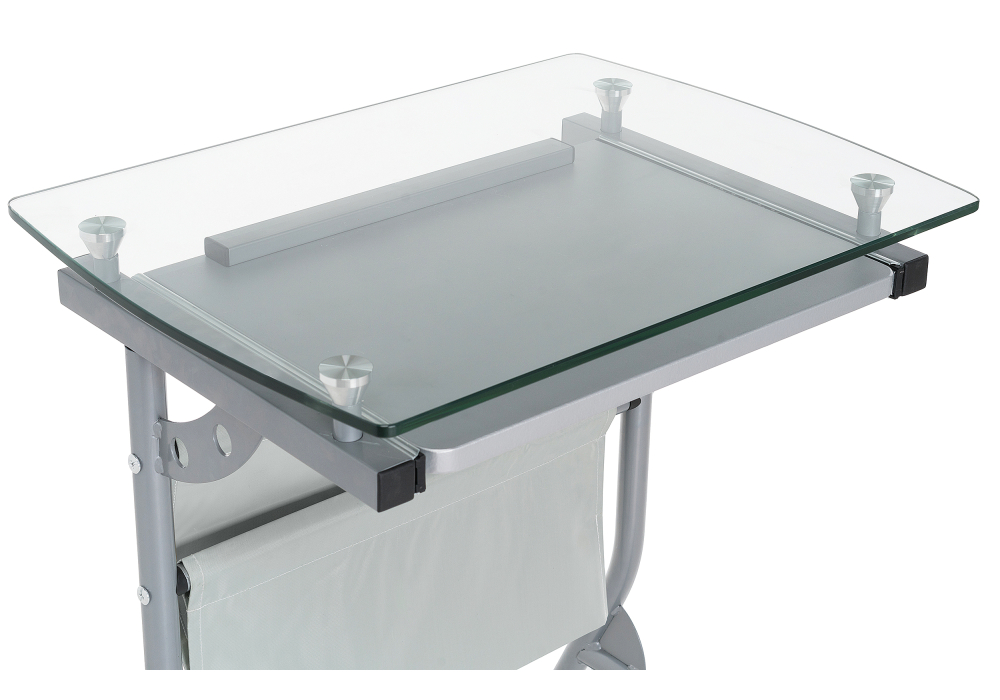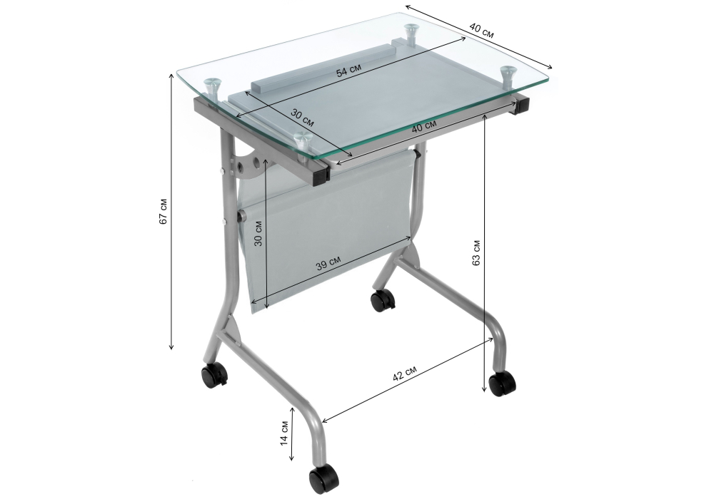 Толщина ДСП - 16 мм. Материал каркаса - Металл; Материал ножек - Металл; Материал столешницы - Стекло; Цвет каркаса - Серый; Цвет ножек - Серый; Цвет столешницы - Прозрачный; Цвет подстолья - Серый; Ширина - 40; Высота - 67; Длина - 54.