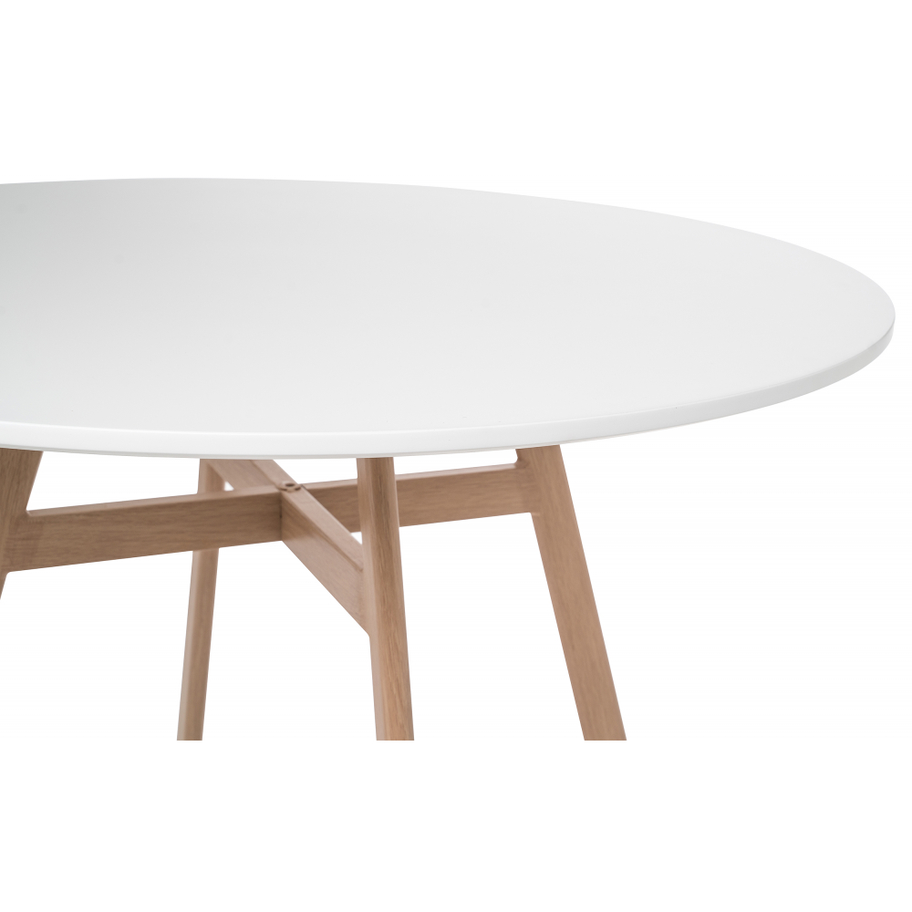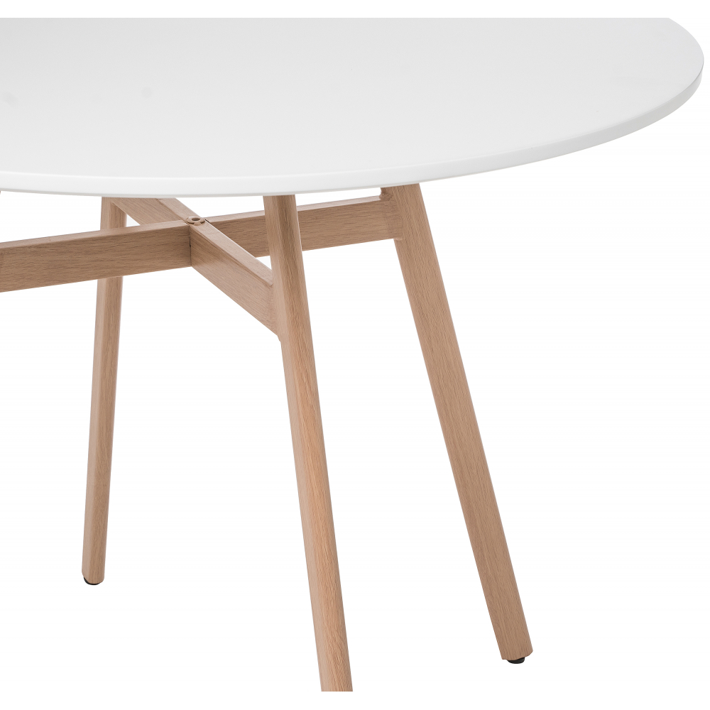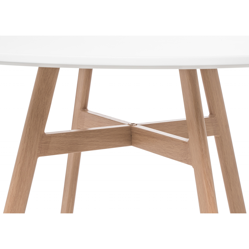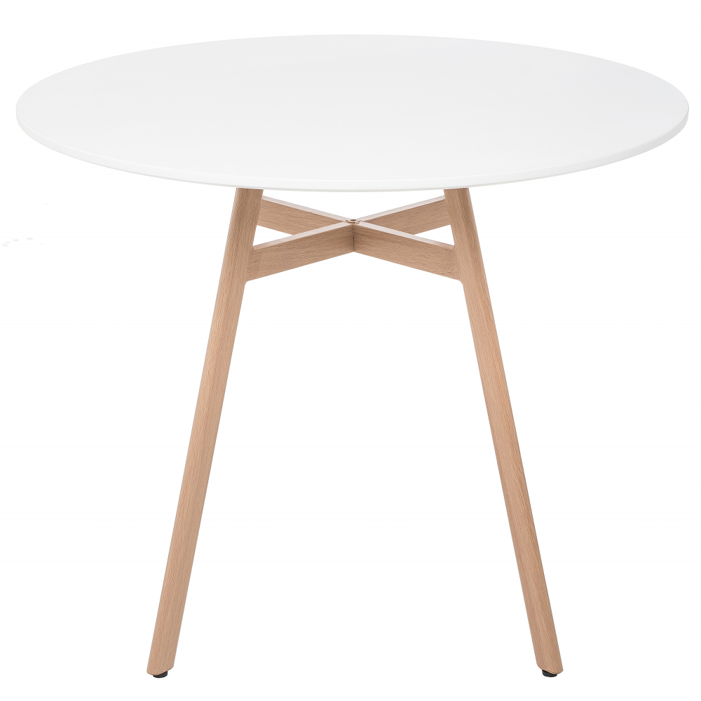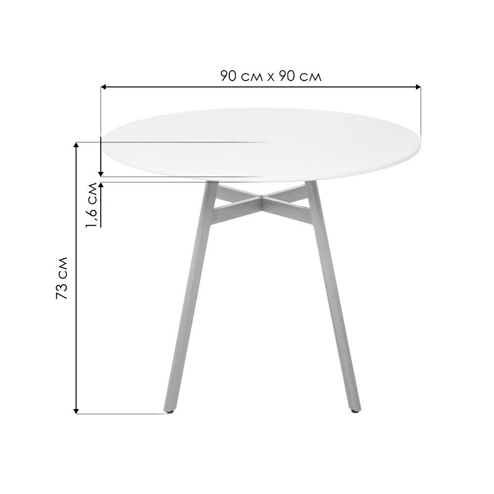Ножки выполнены из металла, которые обтянуты пленкой с имитацией дерева. Материал каркаса - Металл; Материал ножек - Металл; Материал столешницы - МДФ; Цвет каркаса - Натуральный; Цвет ножек - Натуральный; Цвет столешницы - Белый; Ширина - 90; Высота - 73; Длина - 90.