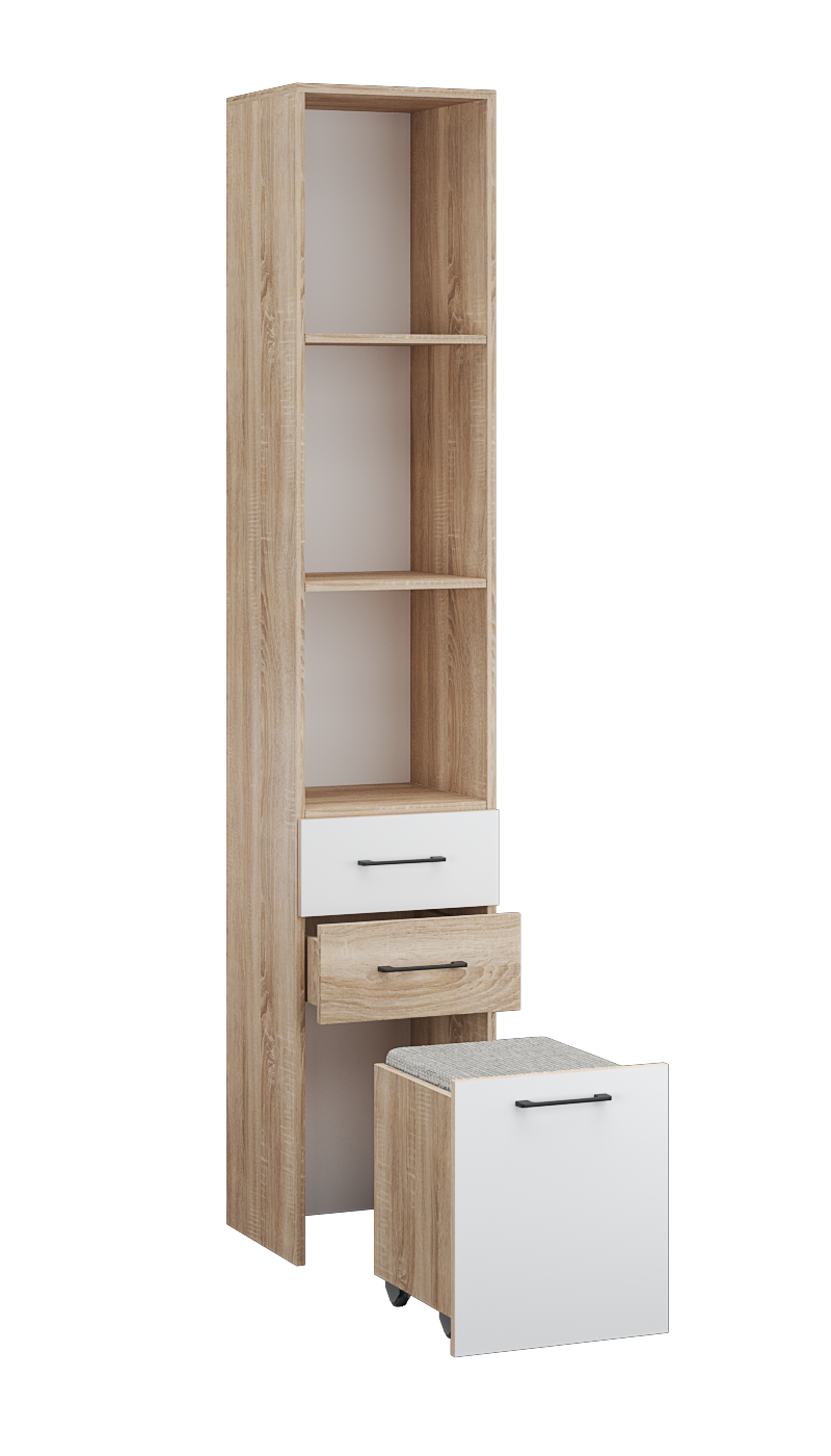 Комбинированный шкаф-пенал Денвер - универсальное решение для организации хранения в малогабаритной прихожей. Имеет набор полок за дверцей, 2 ящикаи выдвижной пуф. Уникальный модуль, поскольку содержит место для хранения вещей и место сидения, которое легко спрятать.