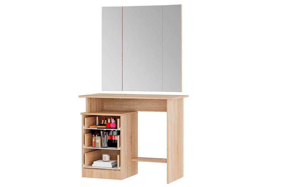 Туалетный столик Сакура - незаменимое дополнение к основному мебельному гарнитуру в современной спальне. Модуль будет гармонично смотреться в интерьере в скандинавском и эко-стилях и позволит Вам с комфортом обустроить женский уголок. Процесс нанесения макияжа и ухода за собой станет еще приятней и удобней благодаря большому зеркалу и трем ящикам для хранения косметики, аксессуаров и других мелочей. Открытая полочка пригодится для тех вещей, которые хочется не терять из виду.