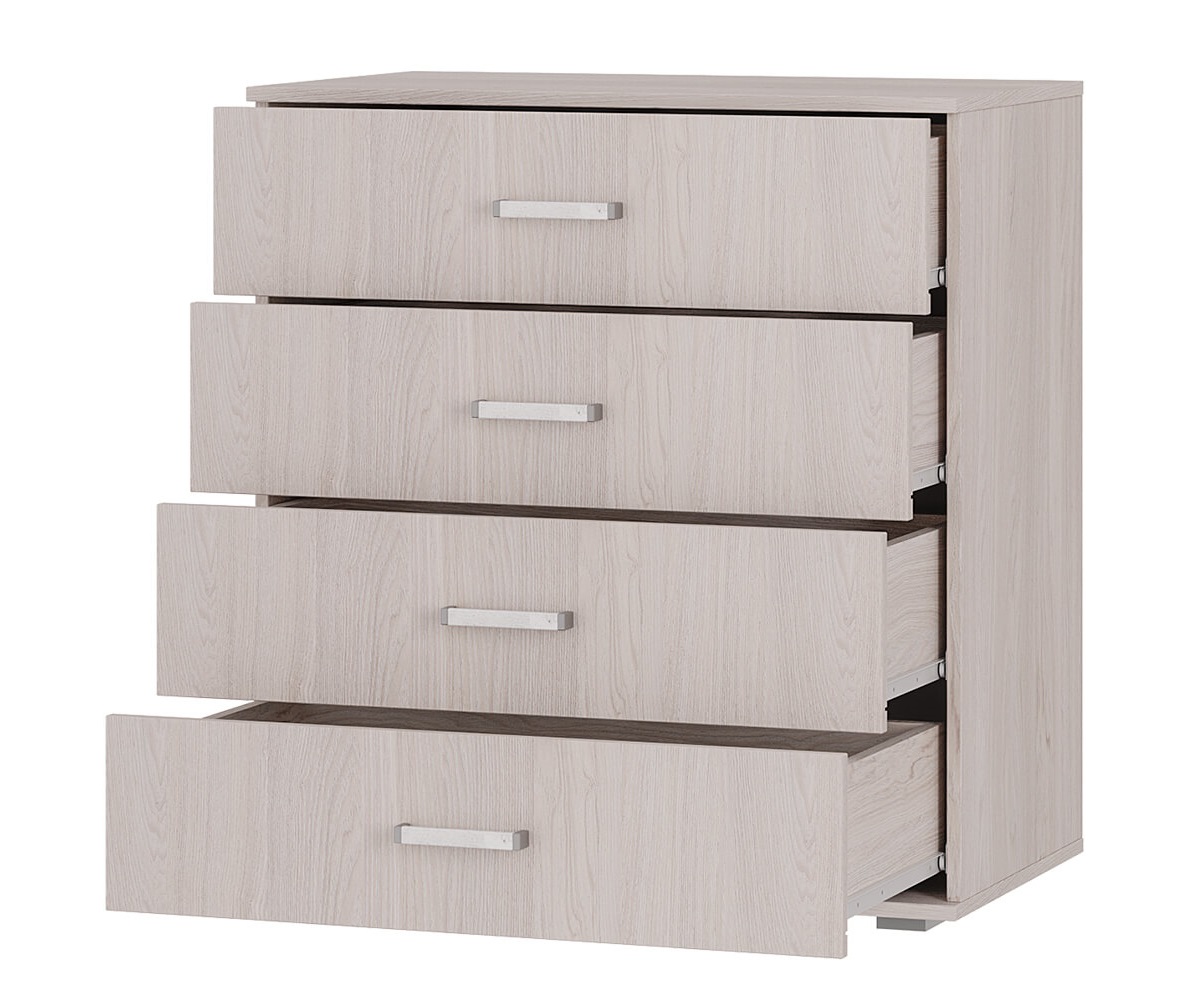 Комод Белла КМ-02 можно использовать в качестве дополнения к мебельному гарнитуру в спальне, а также в гостиной или прихожей в классическом стиле. 4 вместительных выкатных ящика пригодятся для хранения одежды в сложенном виде, постельного белья, аксессуаров, коробок с мелочовкой. Максимальная нагрузка на ящик - 10 кг.