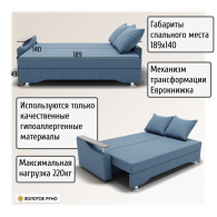 Достоинства: ровное спальное место, лёгкость процесса трансформации дивана, ёмкий бельевой ящик, прочность механизма, долговечность конструкции.