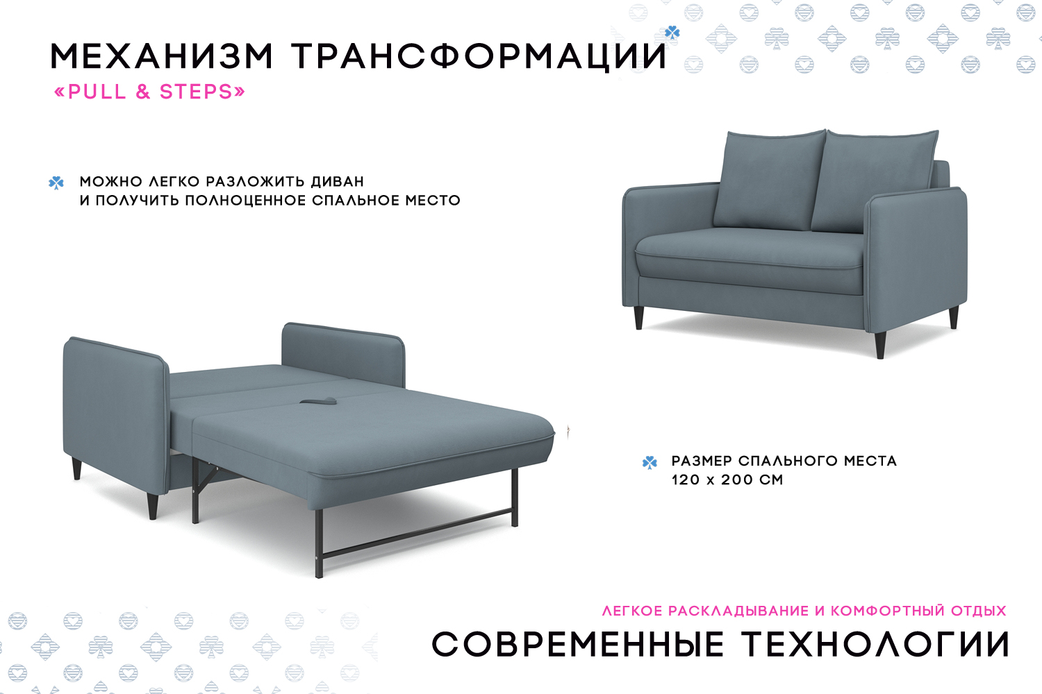 механизм трансформации «pull&steps» (пул энд степс): превращает компактный диван в полноценную кровать. Для этого нужно приподнять сидение по очереди, и, двигая его вверх и вперед, разложить диван, затем опустить спинки в горизонтальное положение;