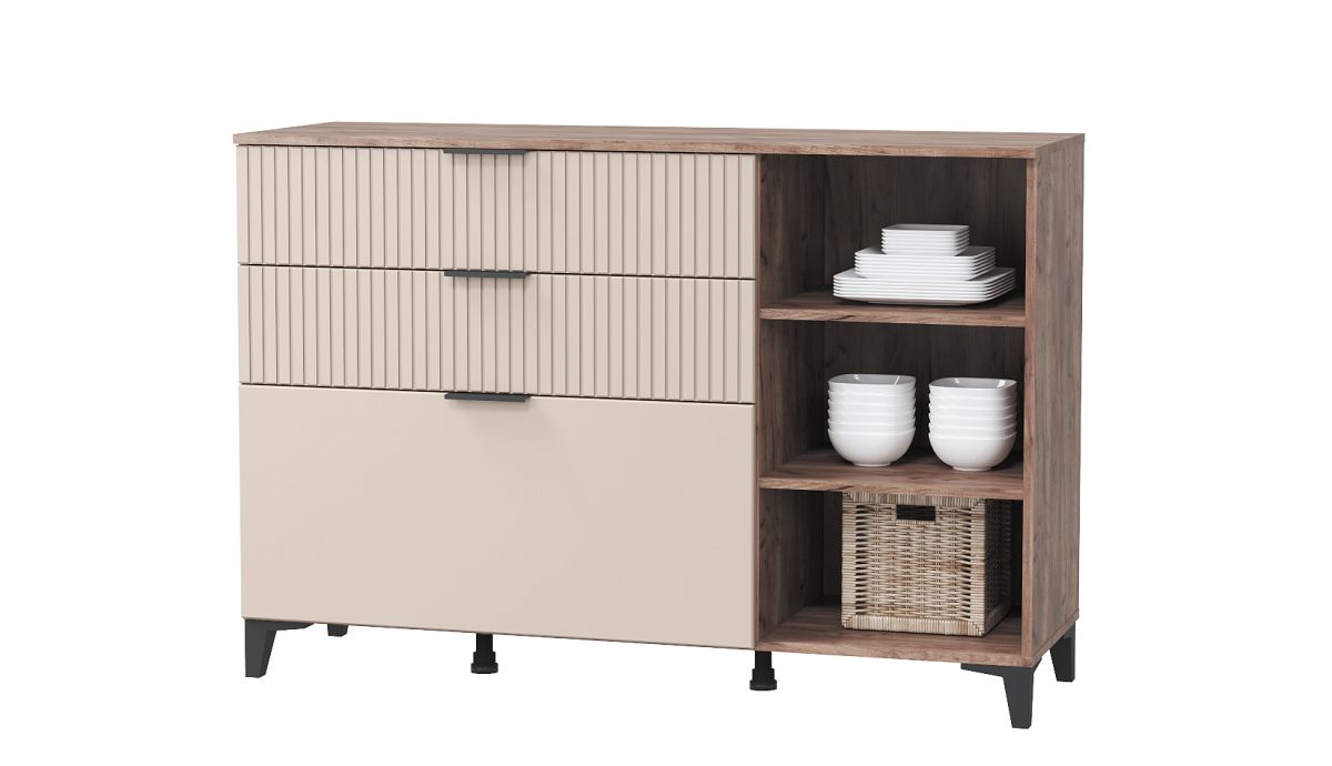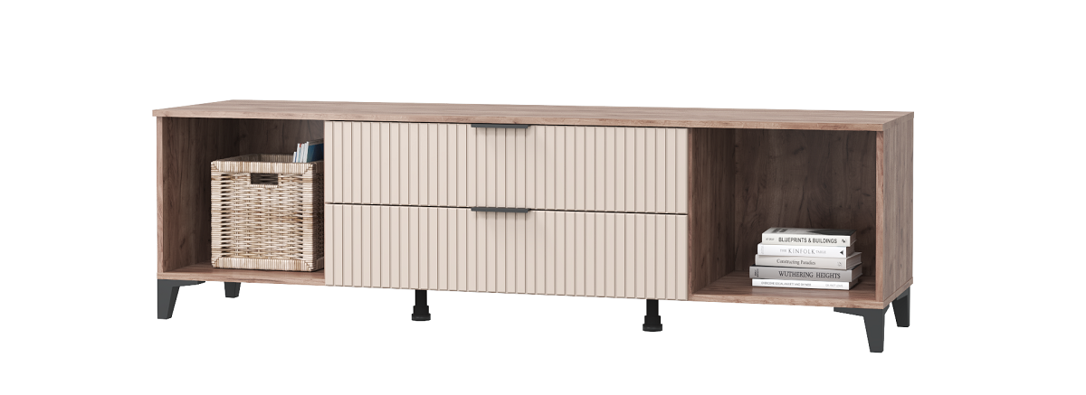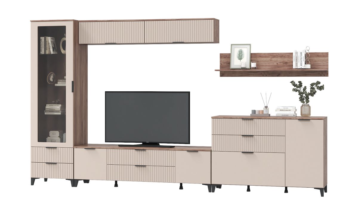 Гостиная из коллекции Тоскана создана для ценителей привлекательной и долговечной мебели в современном стиле. Выполнена в сочетании двух актуальных декоров - теплого древесного "дуба табачного" и пастельного "бисквита" с геометрическим декором. Габариты и наполнение модулей позволят Вам собрать уникальный комплект, который будет гармонично смотреться в любой по площади гостиной и украшать ее интерьер, не загромождая пространство. Комплект состоит из широкой тумбы под телевизор, шкафа-витрины со стеклянной дверцей, двух навесных шкафчиков, комбинированного комода и открытой полки.