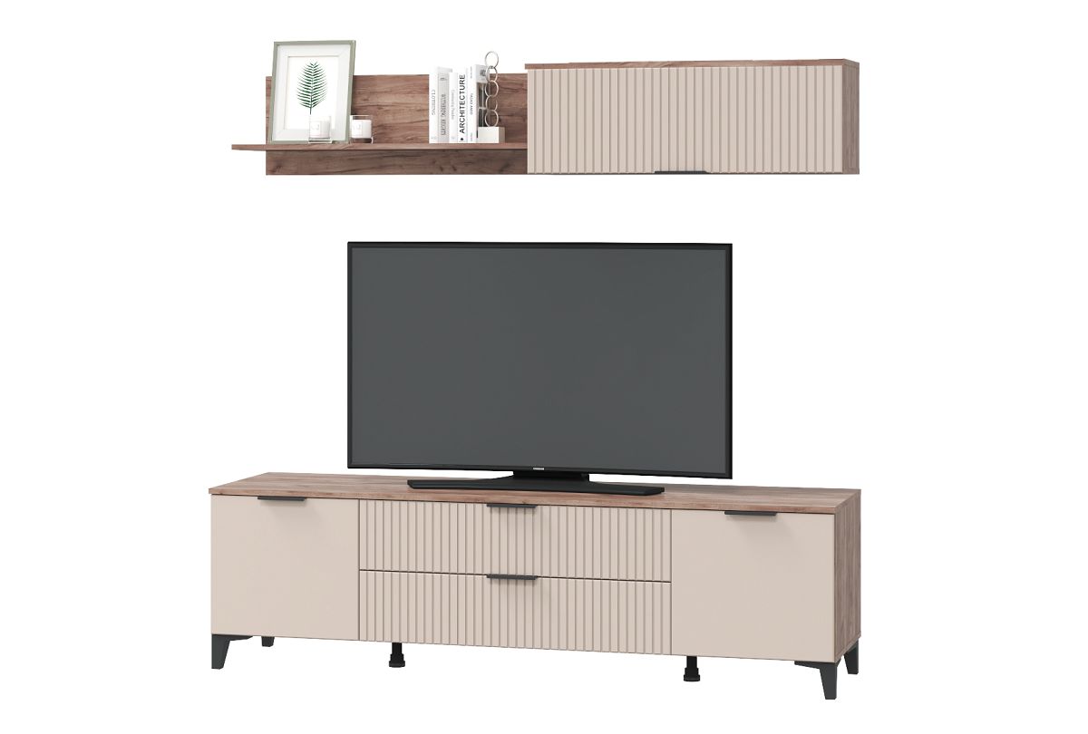 Комплект 2 состоит из широкой тумбы под телевизор, навесного шкафчика и открытой полки. Это отличное решение для малогабаритки и квартиры-студии.