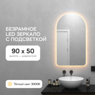 Безрамное зеркало арочной формы с контурной (тыльной) тёплой подсветкой, свет 3000К. Подложка из высококачественного МДФ, светодиодная лента защищена матовым свето-рассеивателем от попадания пыли и влаги. Есть вывод 220W для подключения к сети (блок питания подсветки 12V), включение подсветки от выключателя на стене, либо от розетки.