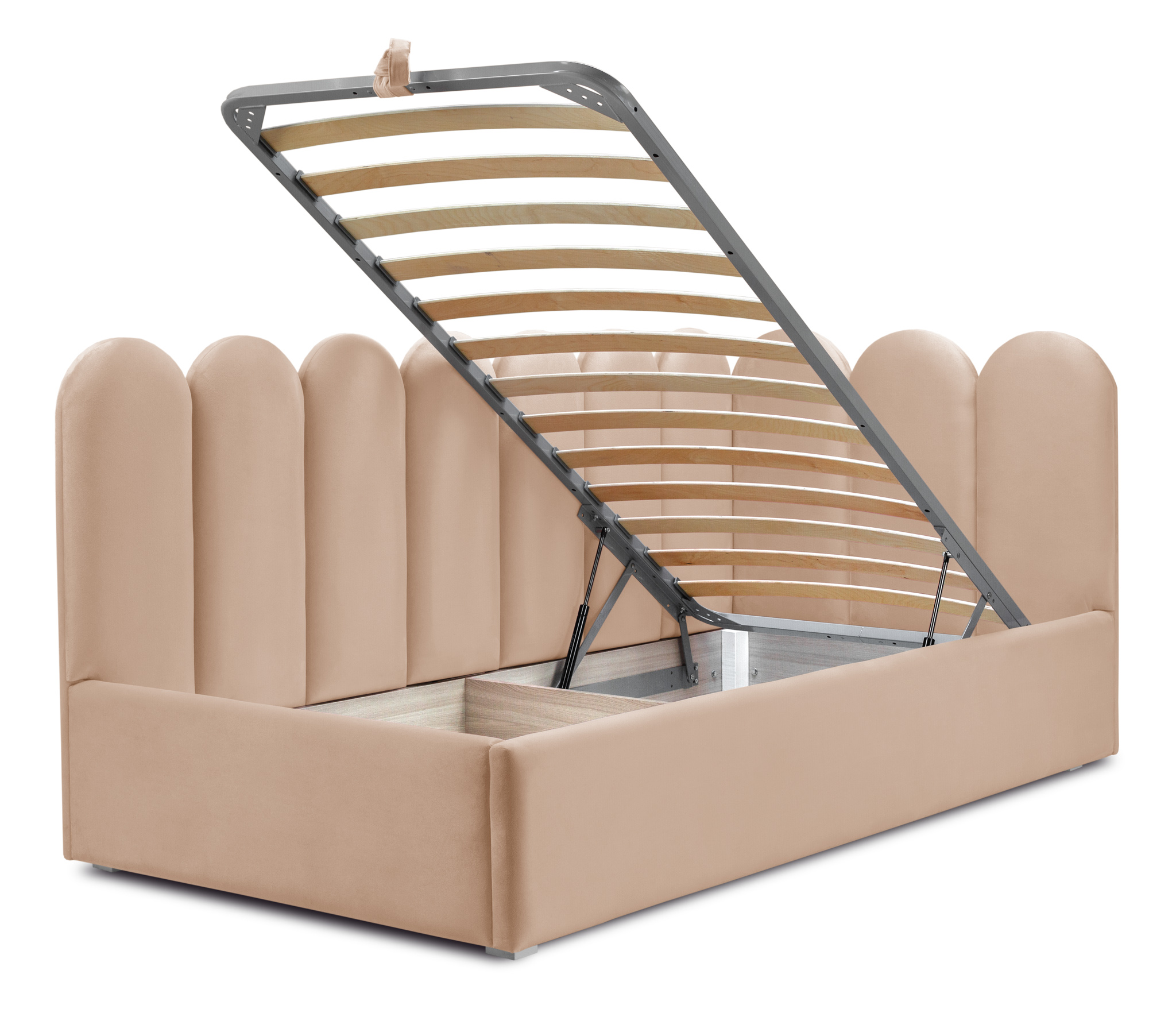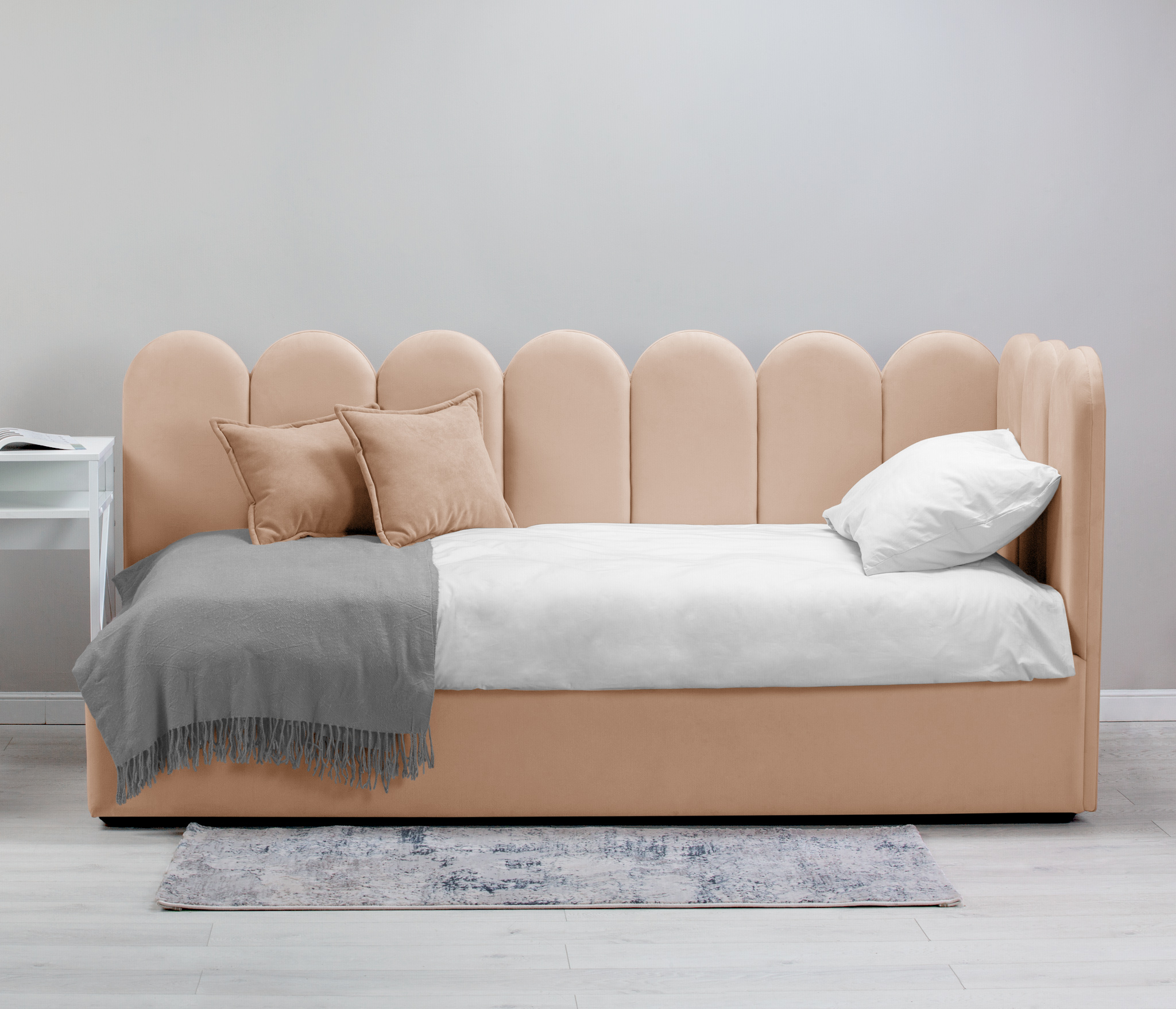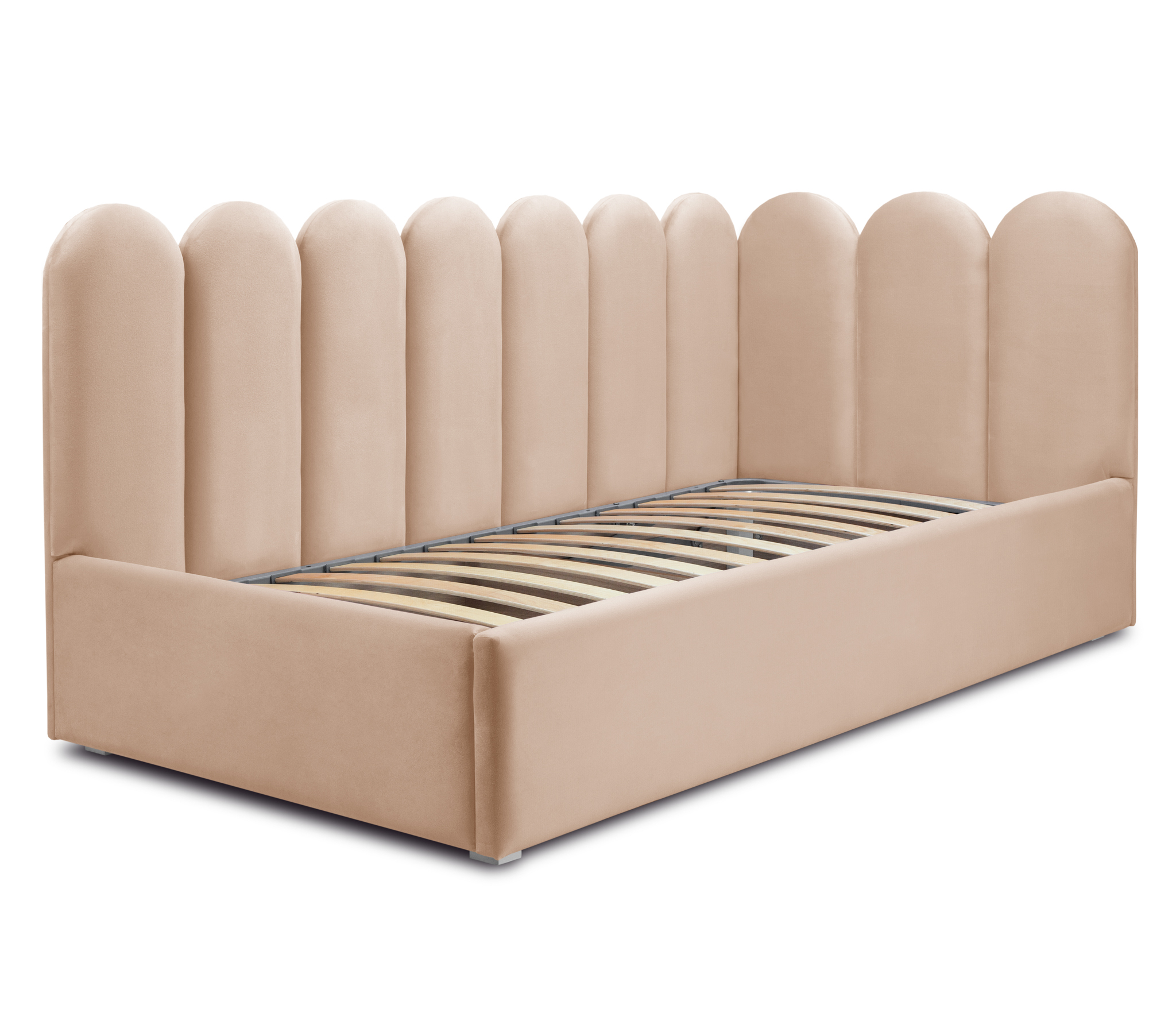 Кровать выполнена из качественного микровелюра, который с легкостью чистится при необходимости.