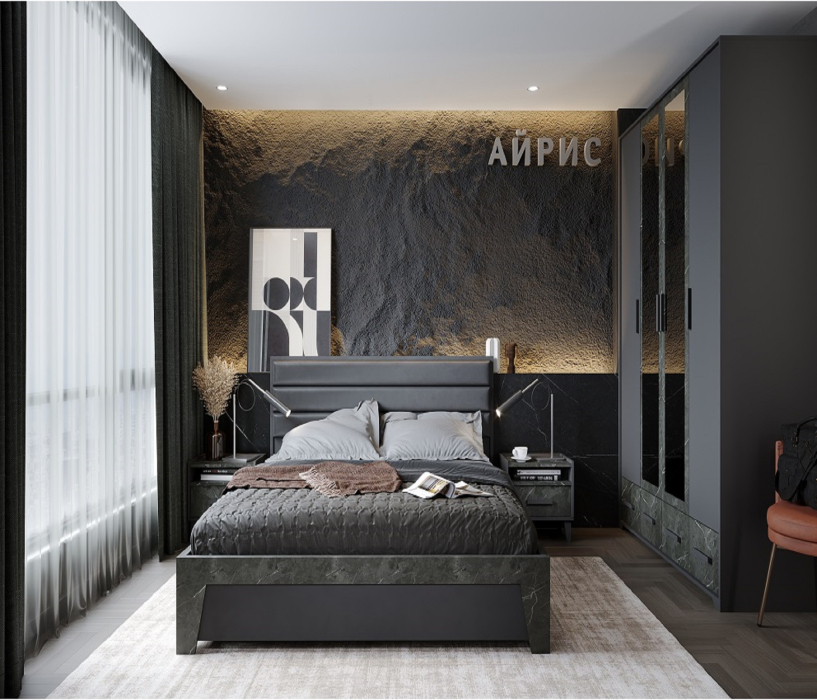 Оригинальный глубокий декор "антрацит/креатель" модульной коллекции Айрис не оставит равнодушными ценителей стильной и качественной мебели. Комплект 5 состоит из двуспальной кровати, двух прикроватных тумб, вместительного шкафа для одежды и белья с зеркалом.