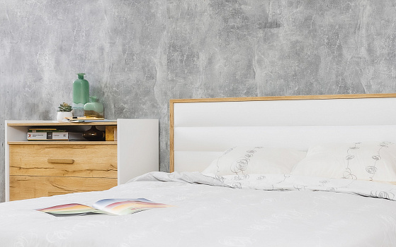 Ключевым элементом в Вашей современной спальне станет двуспальная кровать Айрис. Текстурные опоры и массивная рама на изголовье поддерживают эко-направленность всей коллекции, выполненной в скандинавском стиле. Мягкая спинка со стяжкой обтянута белой экокожей, которая не боится деформации и не требует специального ухода. Кровать комплектуется ортопедическим основанием с подъемным механизмом.