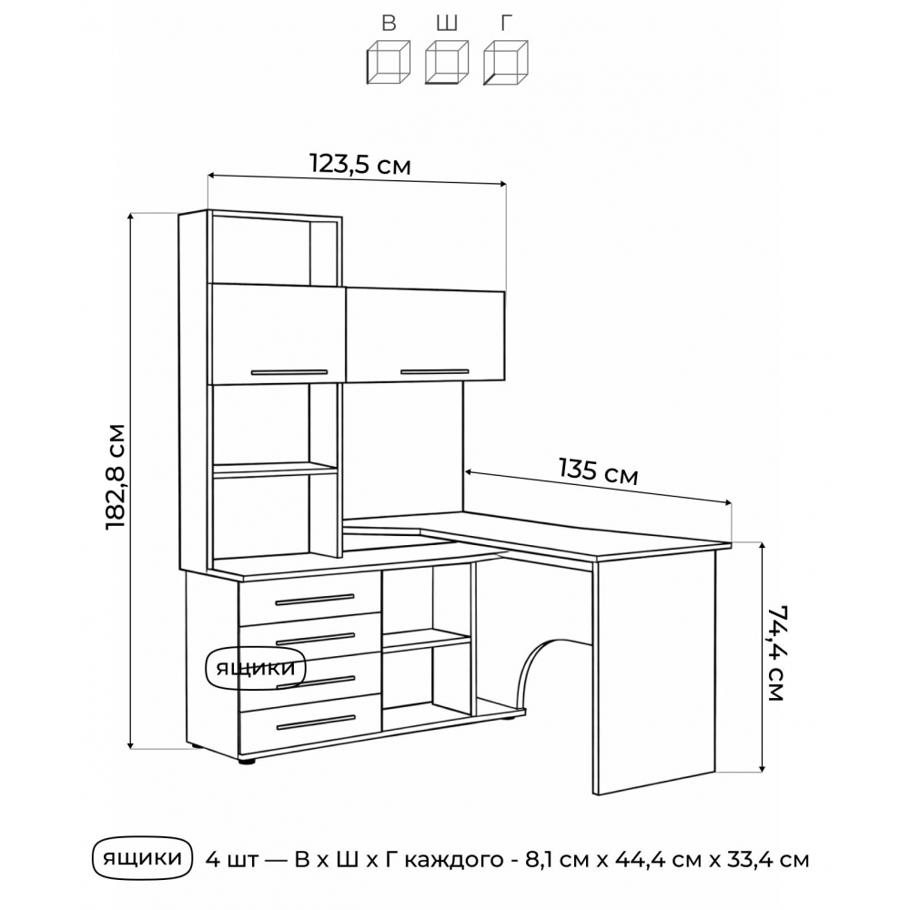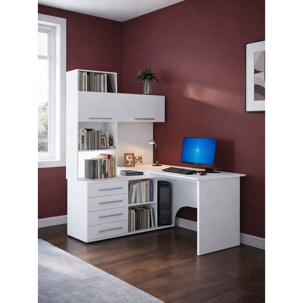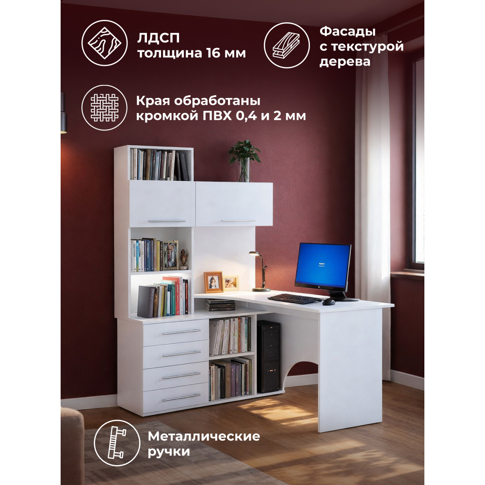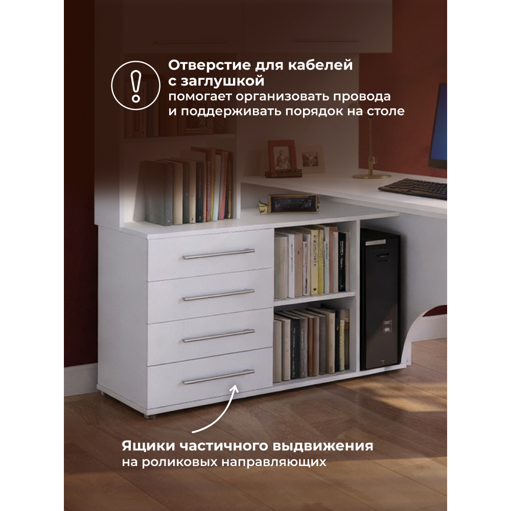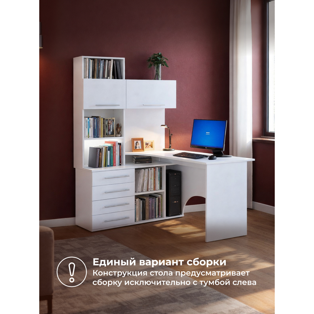 Стол КСТ-14Л белый левый; ЛДСП. Высота столешницы 74,5см. Рабочее место - 135х60см. Толщина ЛДСП - 16мм. Имеется 4 выкатных ящика на роликовых направляющих, 2 дверцы с подъёмными газлифтами. Огромная вместительность для учёбы