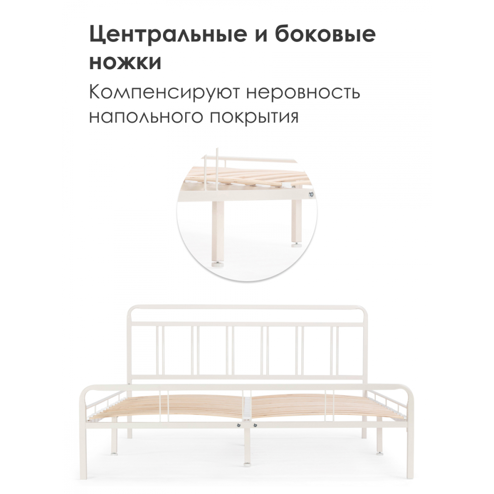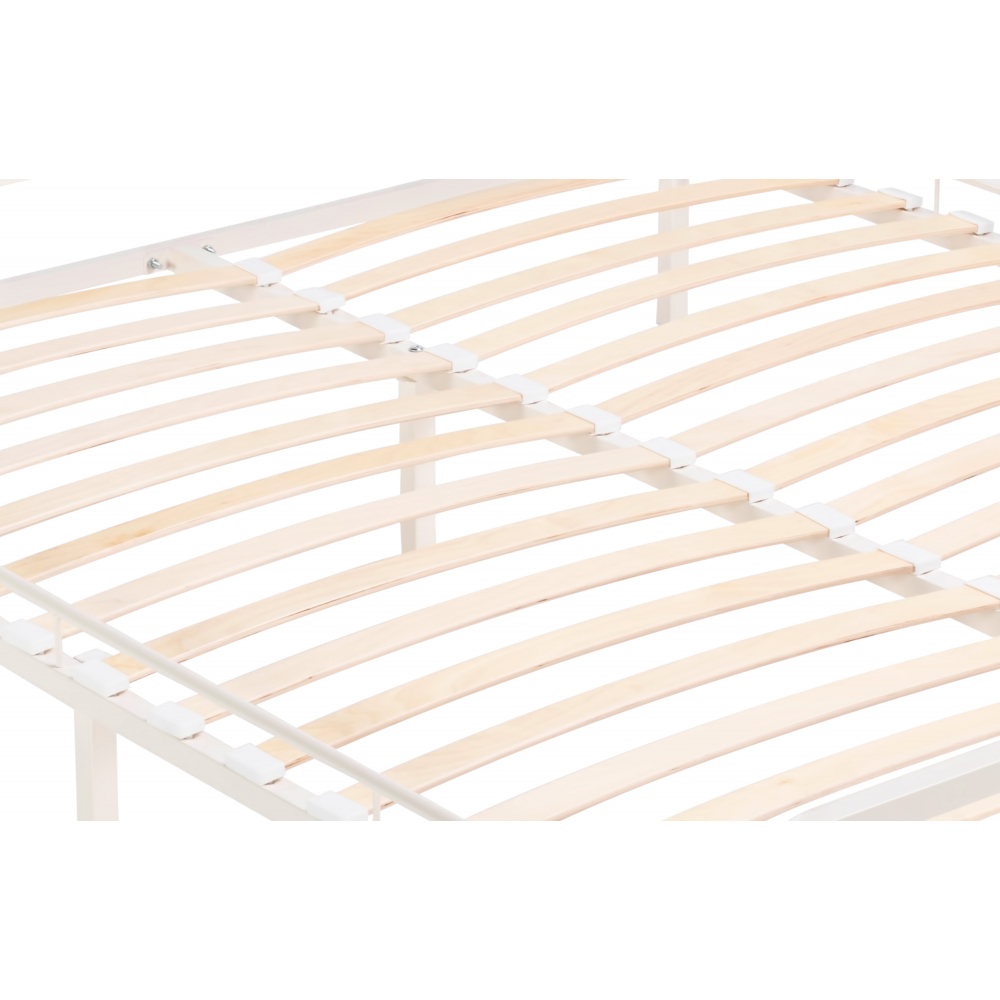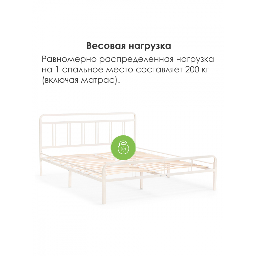 Материал каркаса - Металл; Материал ножек - Металл; Ортопедическое основание - в комплекте; Материал ортопедического основания - с деревянными ламелями; Цвет каркаса - Белый; Цвет ножек - Черный; Ширина - 126; Глубина - 206; Высота - 90,3; Размер спального места - 120 х 200; Длина кровати - 206; Ширина кровати - 126; Высота изножья - 46,3; Высота изголовья - 90,3.
