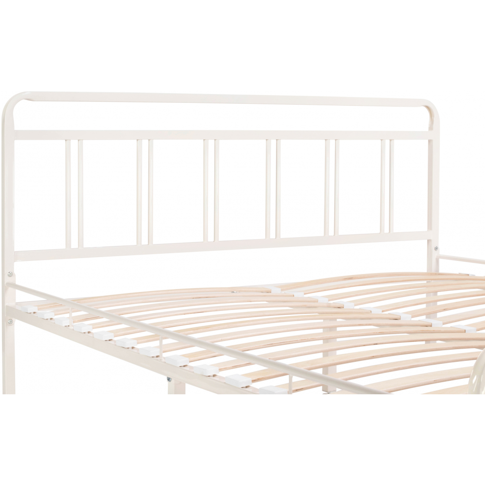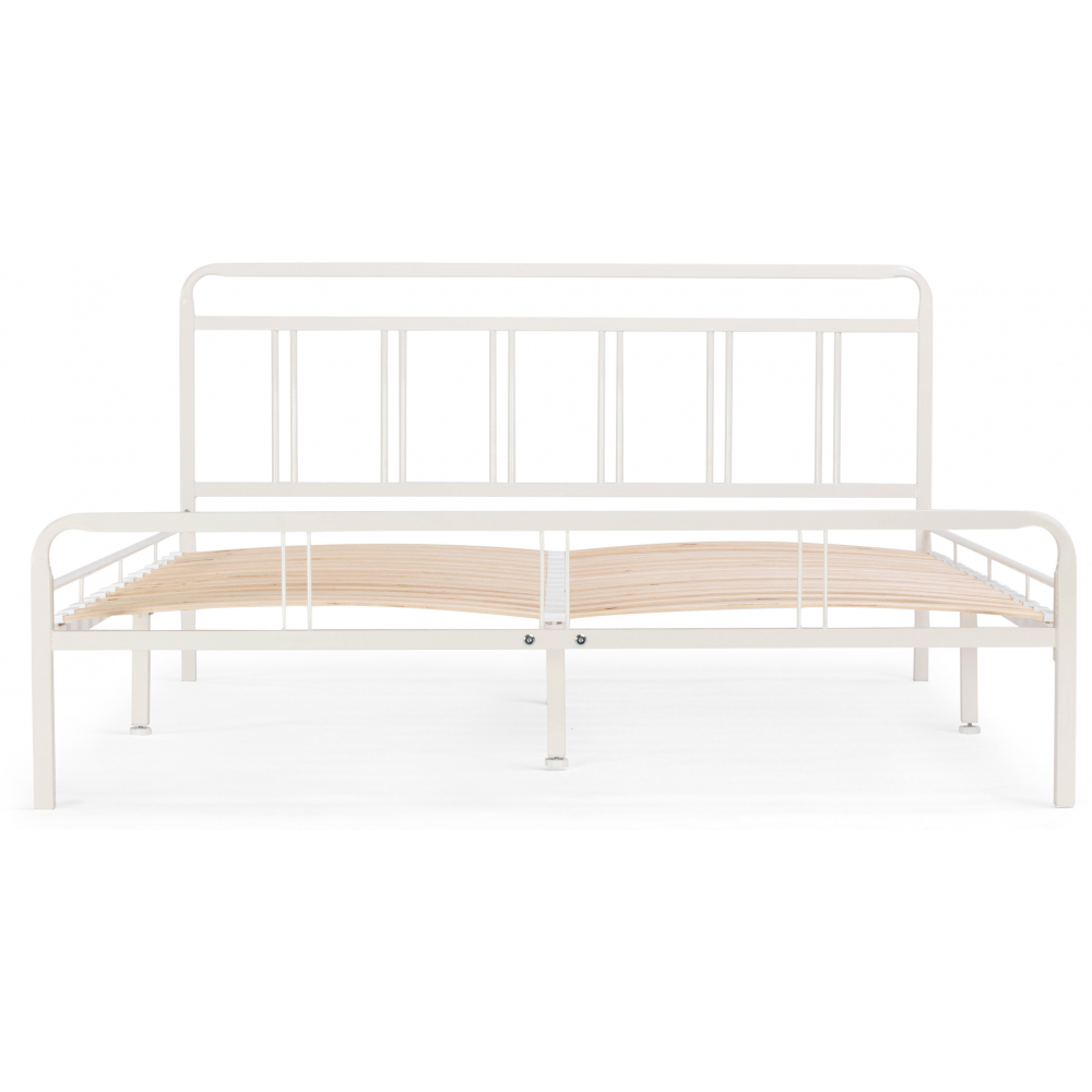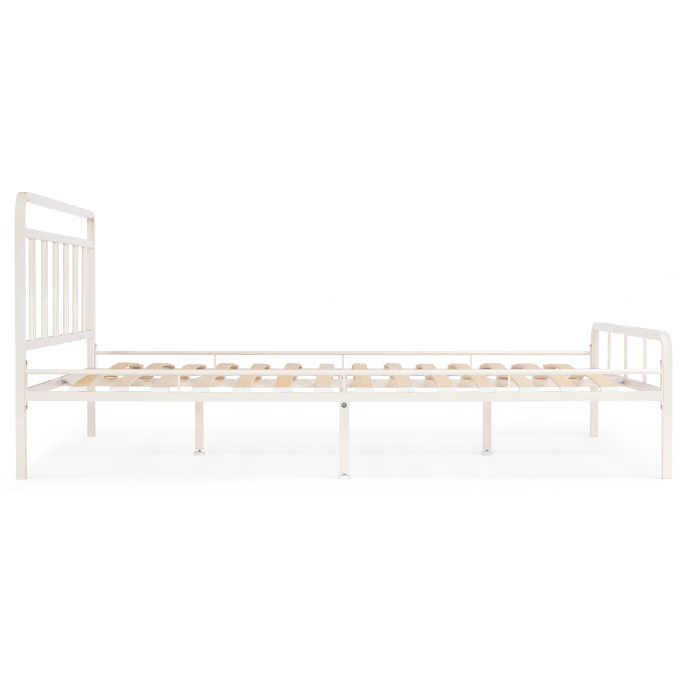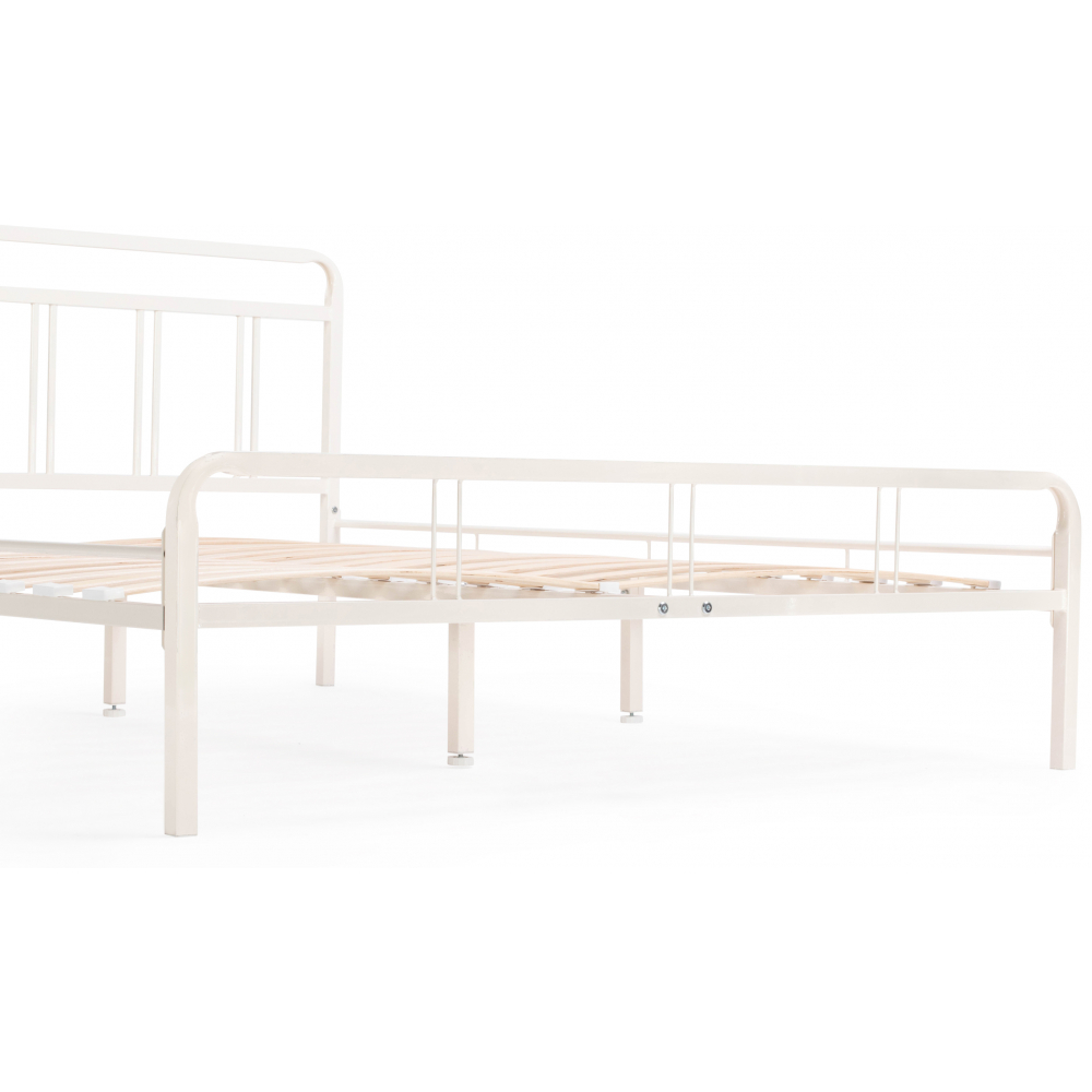 Материал каркаса - Металл; Материал ножек - Металл; Ортопедическое основание - в комплекте; Материал ортопедического основания - с деревянными ламелями; Цвет каркаса - Белый; Цвет ножек - Черный; Ширина - 126; Глубина - 206; Высота - 90,3; Размер спального места - 120 х 200; Длина кровати - 206; Ширина кровати - 126; Высота изножья - 46,3; Высота изголовья - 90,3.
