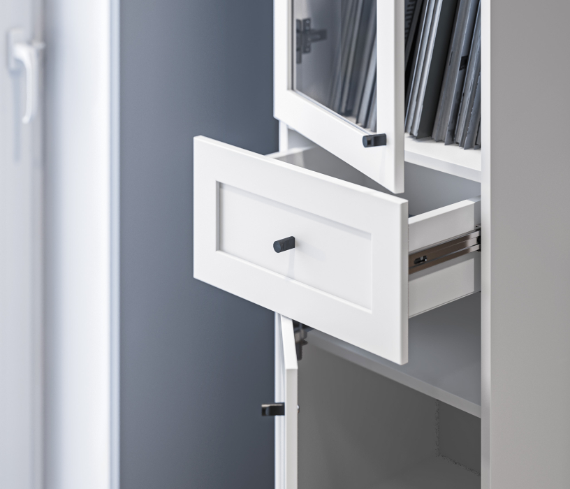 МС Твин предоставляет возможность собрать шкаф или стеллаж по своему вкусу. Вы сами выбираете размеры, цвет ручек: белый или черный, наполнение: ящик или полки. Помимо этого, вы можете решить, оставить фасады глухими или выбрать стеклянные, чтобы добавить прозрачности и легкости в ваш интерьер. Создайте шкаф-стеллаж, который идеально подходит для ваших потребностей и вписывается в ваш стиль.