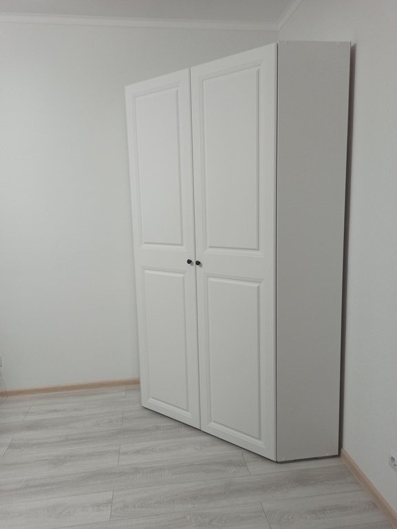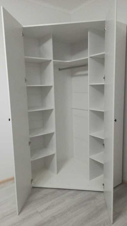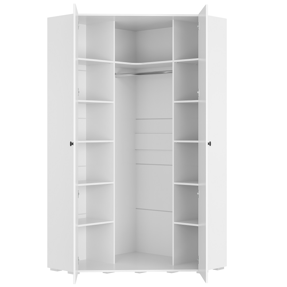 Вместительный шкаф угловой конфигурации с широкой стационарной штангой и комплектом полок. Идеально сочетается с остальными шкафами коллекции Софт в составе шкафной группы.