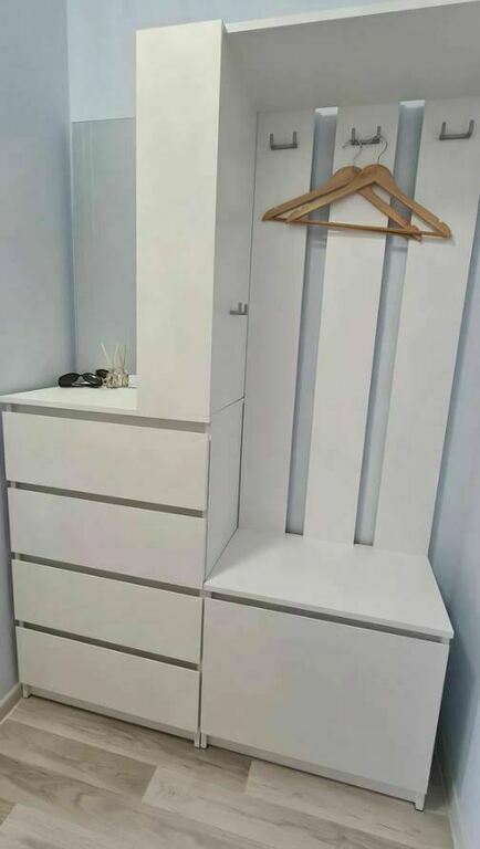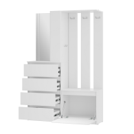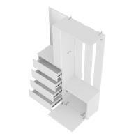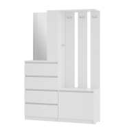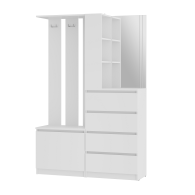 Прихожая Симпл ПР-04 - минималистичное готовое решение для современных интерьеров. Отличается практичным дизайном и максимальной функциональностью. Модуль состоит из 4-х выдвижных ящиков, тумбы с откидной створкой, зеркала, открытых полок, надежных крючков для верхней одежды и верхней полки под сезонные аксессуары.
