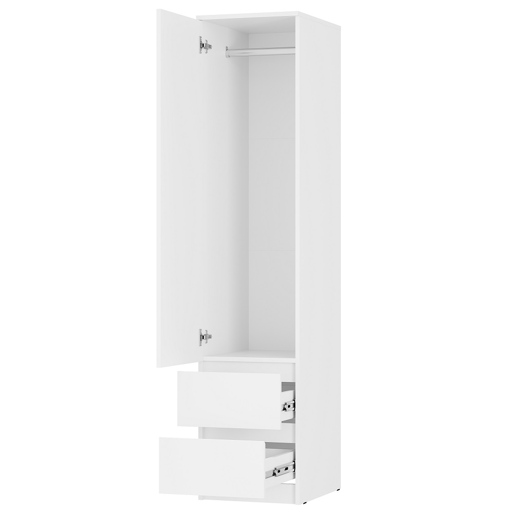Лаконичный шкаф-пенал из серии Симпл идеально впишется в небольшую комнату или квартиру-студию. Наполнение модуля - стационарная штанга и два выдвижных ящика. Можете установить шкаф-пенал в прихожей в качестве системы хранения верхней одежды и сезонных аксессуаров, а в спальне - для того, чтобы с комфортом разместить белье и деликатную одежду на плечиках.