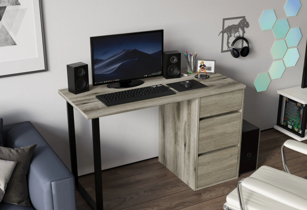 Стол письменный С-401 позволит создать комфортное и стильное рабочее пространство в офисе или домашнем кабинете. Стол С-401 можно использовать в качестве маникюрного стола. Стол имеет прочную стальную опору и тумбу с тремя выдвижными ящиками. Столешница изготовлена из ЛДСП 25 мм. Стол может быть собран в зеркальном варианте «правым» или «левым». Фурнитура: телескопический направляющие полного выдвижения без доводчиков, опора металл.