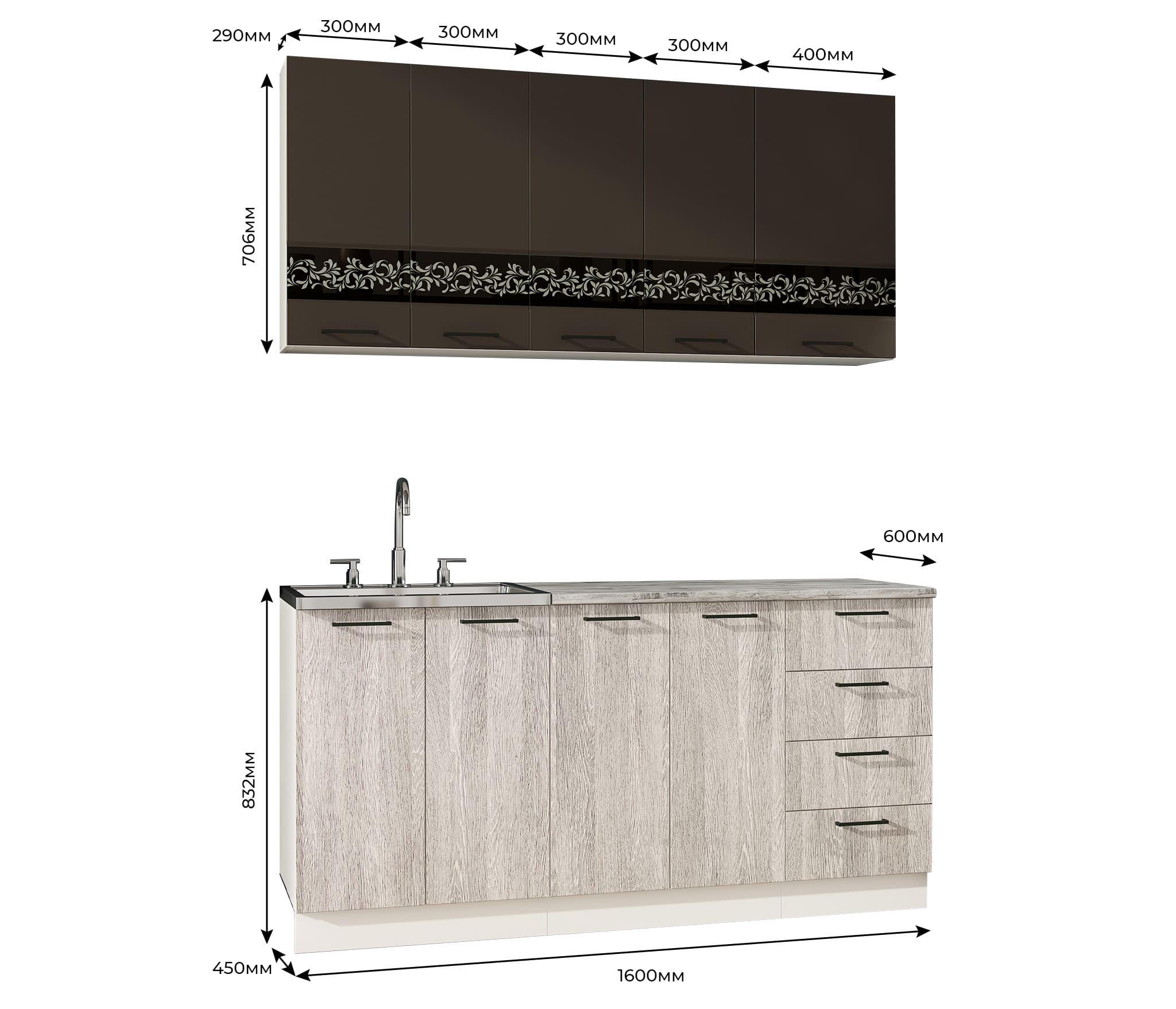 Кухонный гарнитур Милена длиной 1,6 метра подойдёт как для малогабаритной кухни, дачи, так и для небольшой кухни-гостиной. Кухня выполнена в стиле модерн и органично впишется в современный интерьер. Верхние фасады в цвете темного шоколада с мягкой матовой текстурой создадут ощущение тепла и напомнят о вечерних посиделках у камина загородного дома. Нижние фасады с текстурой дерева вяз создадут атмосферу городского парка. Распашные шкафы и выдвижные ящики вместят всю необходимую посуду, кухонную утварь и продукты. Свободное пространство 1000 х 600 мм позволит вам с легкостью готовить даже сложные и много компонентные блюда.