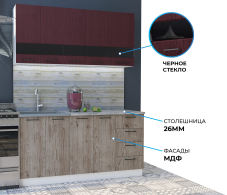 Кухонный гарнитур Астра длиной 1,6 метра подойдёт как для малогабаритной кухни, дачи, так и для небольшой кухни-гостиной. Кухня выполнена в стиле модерн и органично впишется в современный интерьер. Верхние фасады в цвете насыщенного бордо символизируют власть и силу, целеустремленность и уверенность. Нижние фасады с текстурой благородного дуба дополнят смелую кухню брутальностью. Распашные шкафы и выдвижные ящики вместят всю необходимую посуду, кухонную утварь и продукты. Свободное пространство 1000 х 600 мм позволит вам с легкостью готовить даже сложные и много компонентные блюда.