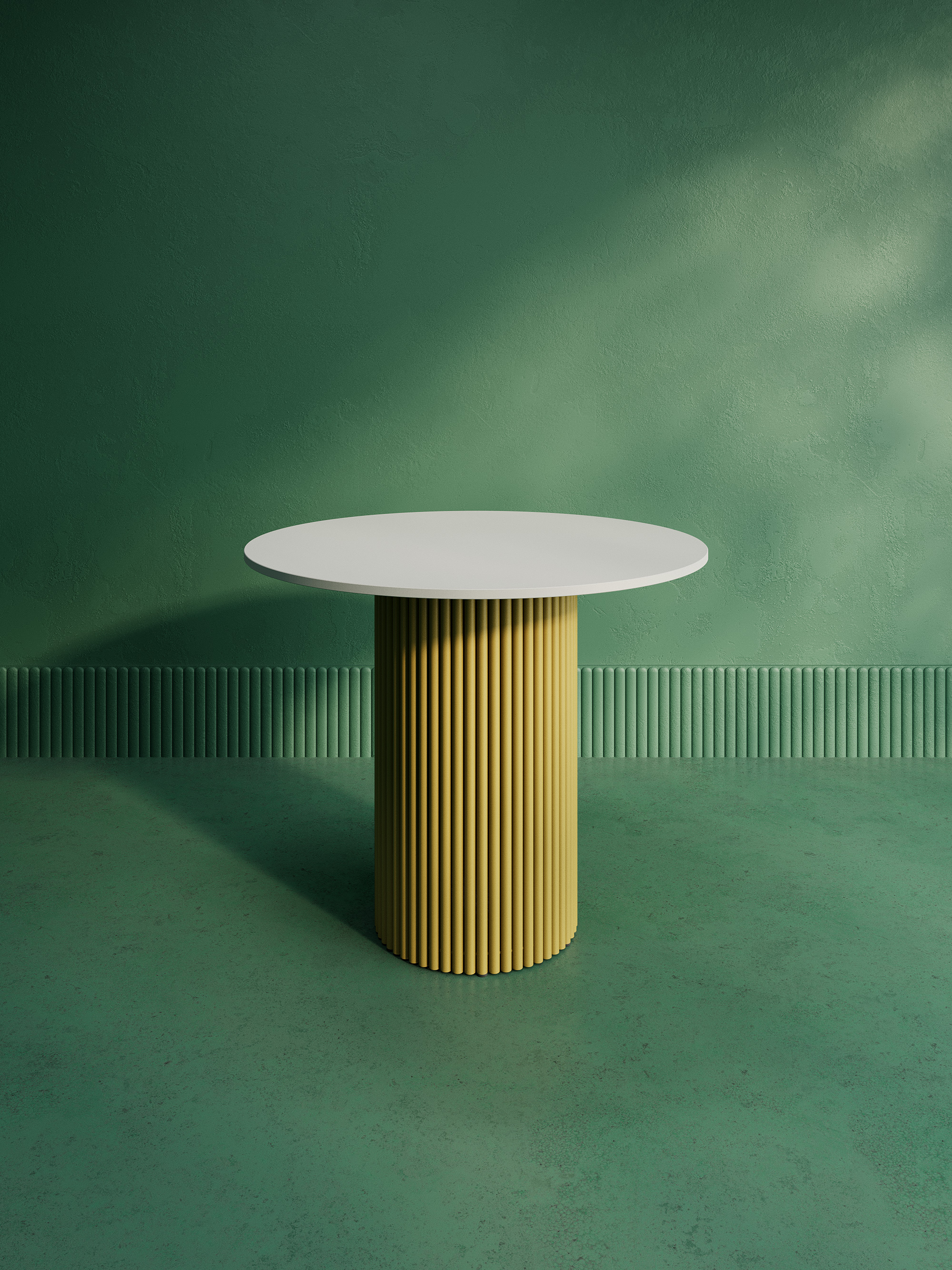 Дизайнерский круглый стол с металлическим трубчатым подстольем. Диаметр подстолья D400 мм. Столешница ЛДСП 16мм, диаметр D900 мм. Стандартный вариант - матовая порошковая окраска в золотой, чёрный или белый цвет. На заказ возможно изготовление столешницы ЛДСП в индивидуальном цвете и размере под заказ.