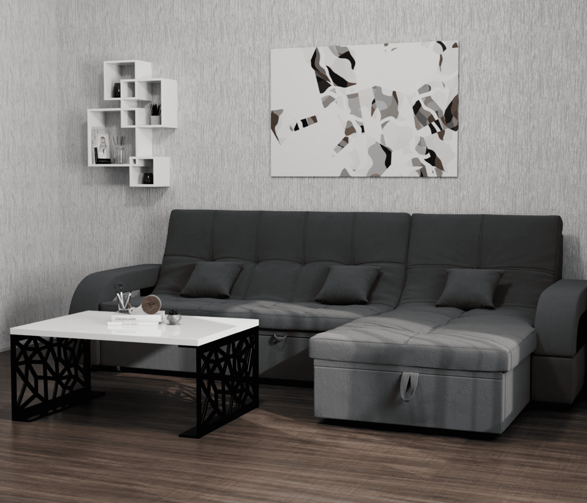 Он имеет высоту 97 см, ширину 268 см и глубину 175 см. Диван обладает универсальным расположением угла, что позволяет его использовать в любом помещении.
